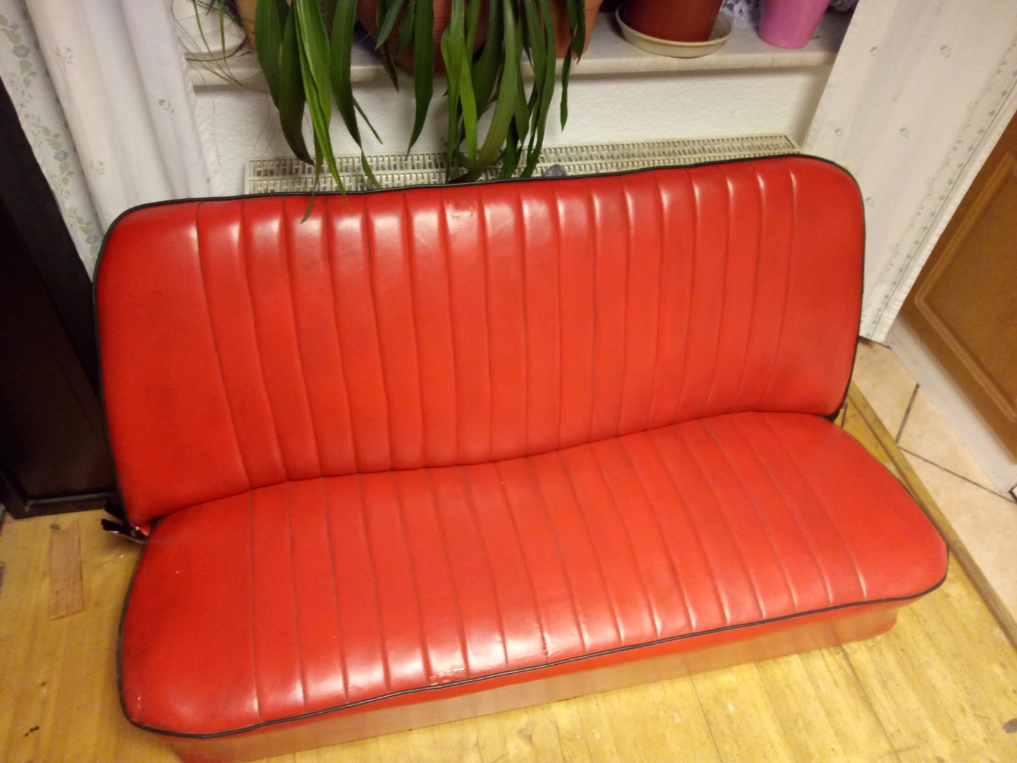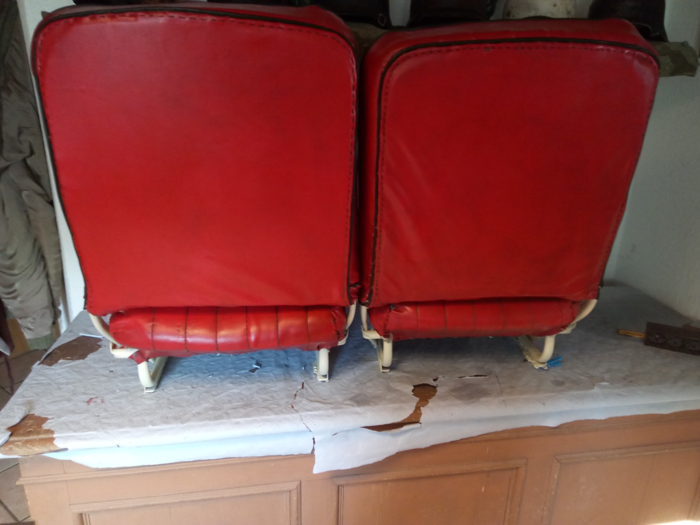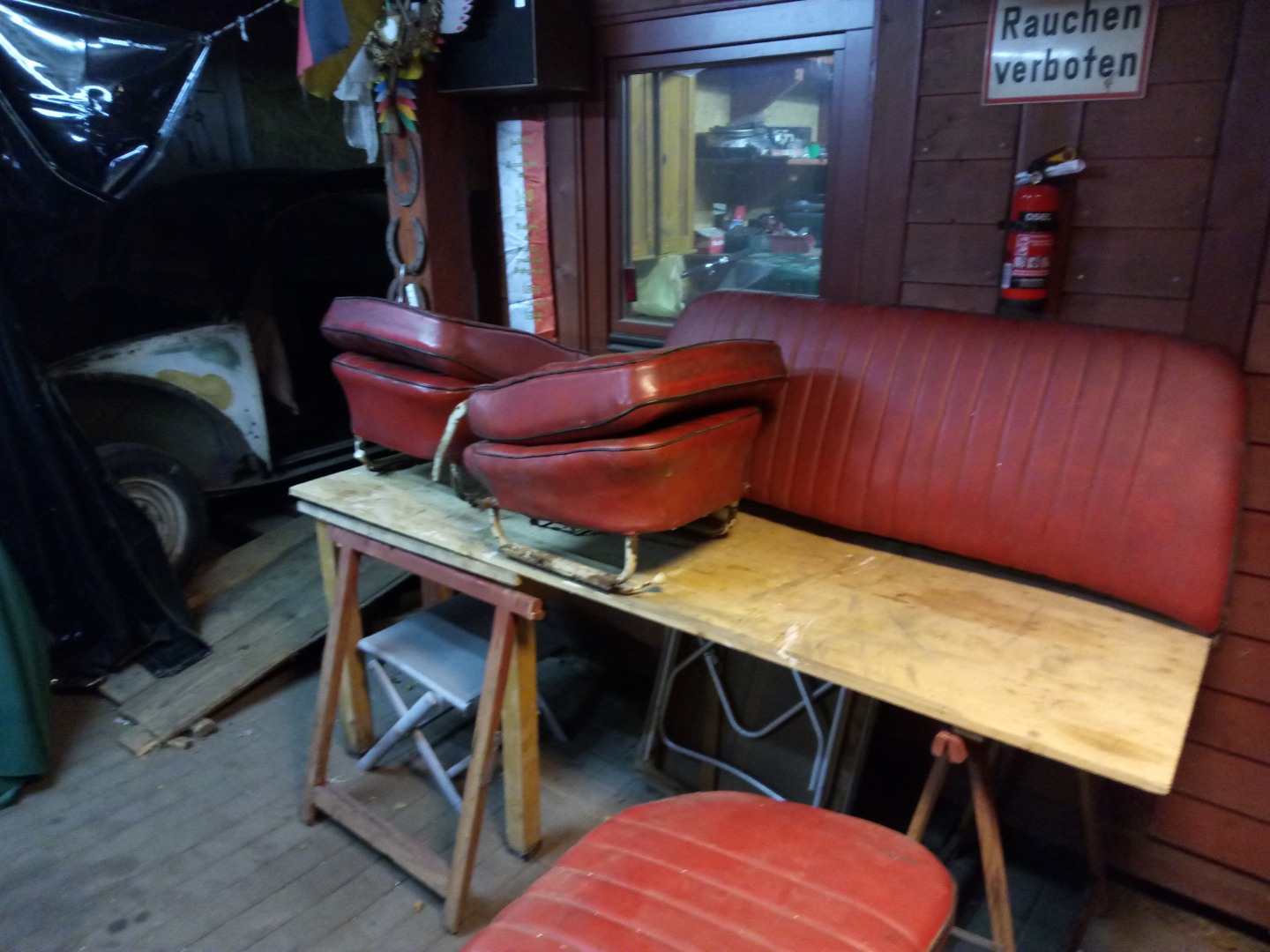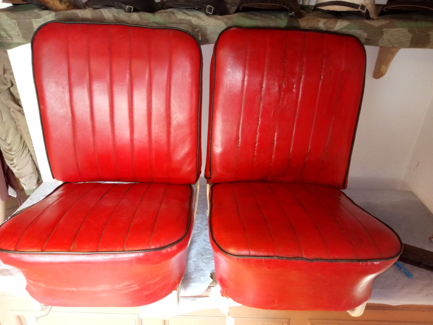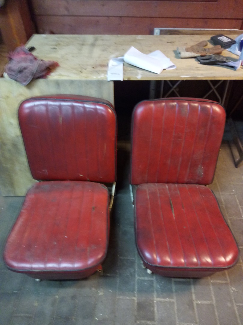 Restauration Inventar. Die Sitze wurden komplett zerlegt, das Kunstleder gereinigt, Risse per Hand vernäht (Mit einer zur Nadel umgebauten Rouladennnadel) konserviert lackiert und wieder zusammengesetzt.