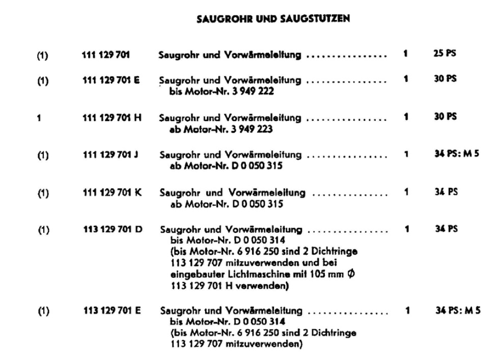 Und der Vollständigkeit halber: Es gibt noch ein seltenes Ansaugrohr für VW Bus vor 1960. Diese Rohre haben eine 211er Nummer und ein kürzeres Rohr zum Anschluss des Vergasers (um den Kofferraum des Busses dichter an den Motor bringen zu können). Dieses Rohr kann man auch leicht mit den Käfer Modellen verwechseln.