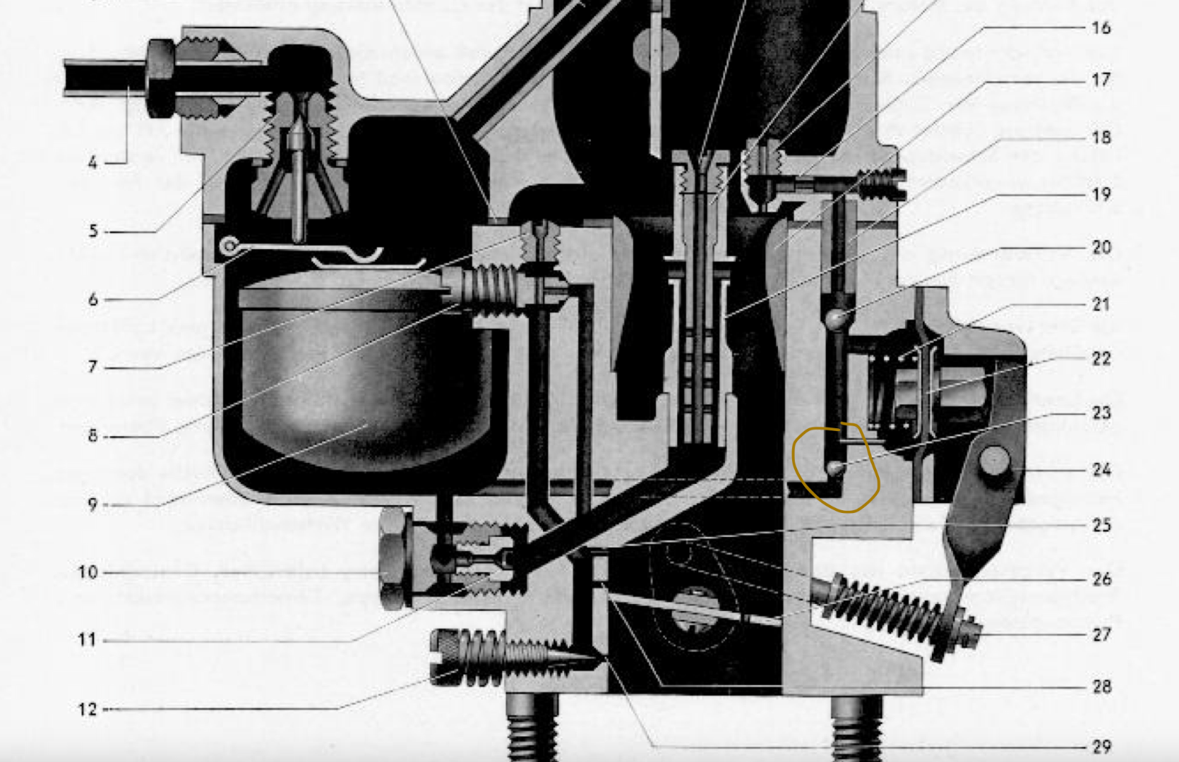 Ich habe es noch nicht probiert, aber evtl. ist es möglich das Röhrchen Nr.18 aus dem Gehäuseunterteil zu ziehen, so dass Du an den Kanal von oben ran kommst. Wenn du den Vergaser dann über Kopf hältst, müsste dir zuerst Kugel 20 und dann 23 entgegen fallen, wenn es nur die größere sein sollte, hast du dann aber die Möglichkeit etwas Kraftstoff (oder schärfere Mittelchen) von oben in den Kanal zu sprühen, so dass sich der Dreck ggf. auflöst.