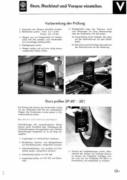 Der Sturz wird schon beim Zusammenbau der Achsschenkel an die Traghebel mit den Beilegscheiben eingestellt. Dazu wird der Versatz des unteren zum oberen Traghebelauge gemessen (soll 7mm+/-2mm) und durch eine entsprechende Anordnung der Beilegscheiben bei Abweichungen von diesem Maß ausgeglichen. Ist also die gesamte Vorderachse entsprechend zusammen gebaut (Beilegscheiben nach Tabelle angeordnet) und die Räder montiert, sollte der Sturz stimmen.