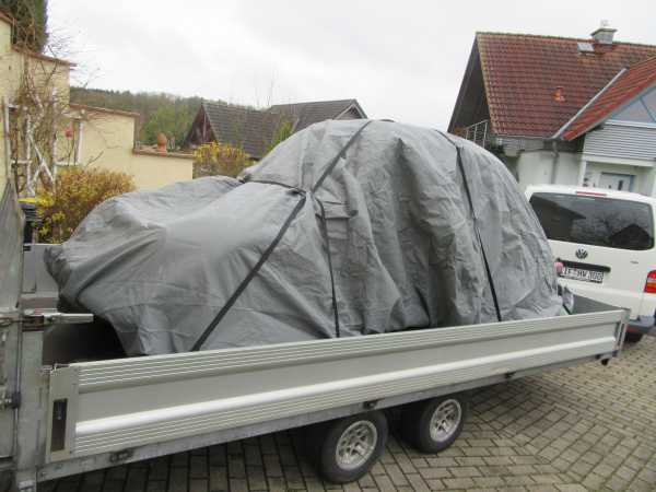 ich habe heute meinen Ovali vom Sattler zur Werkstatt transportiert. Dort soll er zum TÜV vorbereitet werden. Die Scheiben müssen noch eingebaut werden, neue Dichtungen mit Zierrahmen sind auf den Scheiben aufgezogen und fertig für den Einbau nächster Woche (muss die Scheiben noch zur Werkstatt bringen).