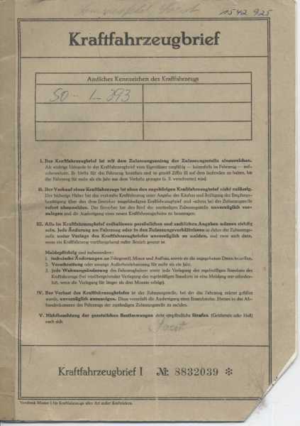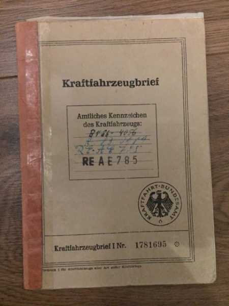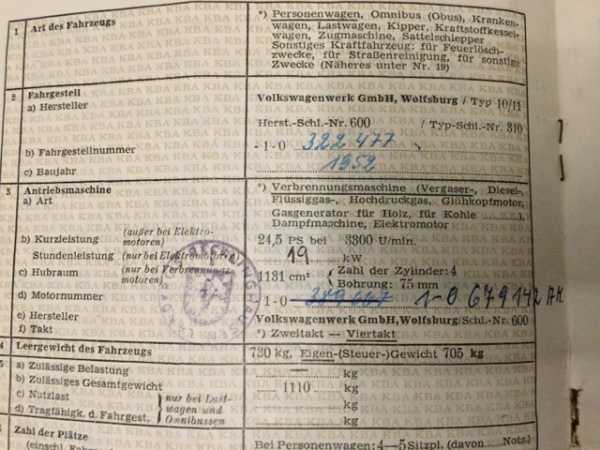 Der Brief wurde am 10.07.1954 in Wolfsburg ausgestellt. Das Fahrzeug wurde am 13.07.1954 auf den Erstbesitzer zugelassen und am 4. Januar 1980, nach ca. 25 1/2 Jahren, stillgelegt.