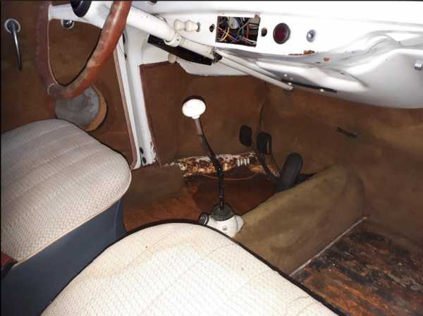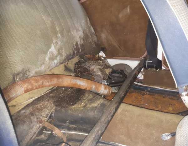 Der Innenraum wurde anscheinend damals schon mit Teppich ausgelegt bzw. verklebt. Nun ist über Jahre hinweg alles nass geworden und dementsprechend ist der Zustand.