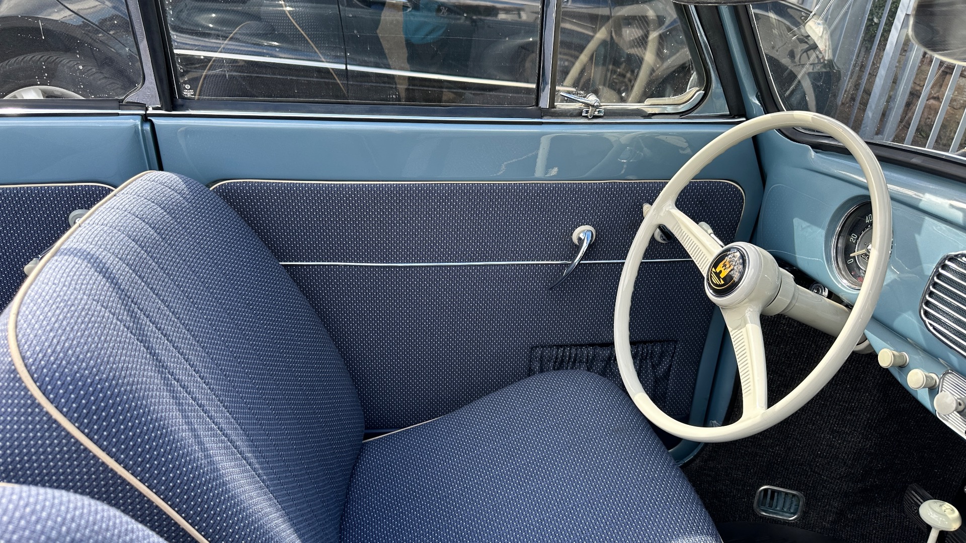 Die Seitenverkleidung aus blauem Stoff mit weißen Pünktchen - wie sie die Limousine ab 55 hatte - wurde kaum für ein Cabrio verwendet (Meine Einschätzung). Daher nehme ich an, dass die Einrichtung in Deinem Cabrio irgendwann erneuert wurde.