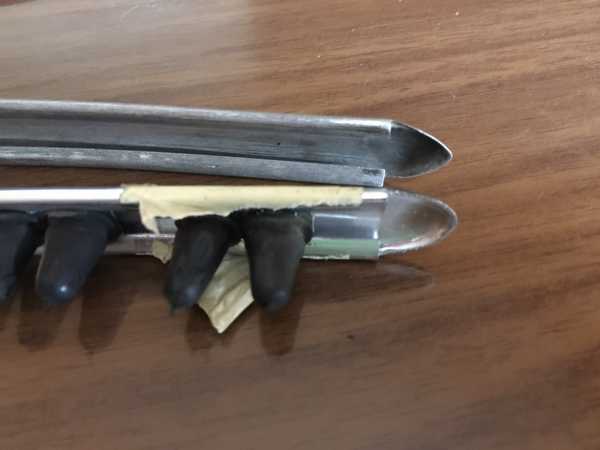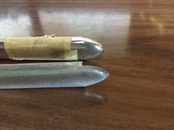 Ich habe aber auch noch mein Original von 1957 und ein Repro aus den 90er. Beim Original ist das Ende ein klein wenig spitzer und die Aussparung etwas tiefer. Länge der Aussparung ist bei beiden gleich. Die Gesamtlänge ist bei beiden 945mm.