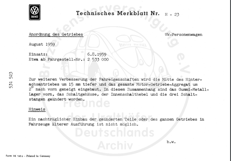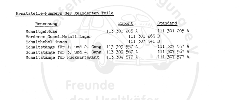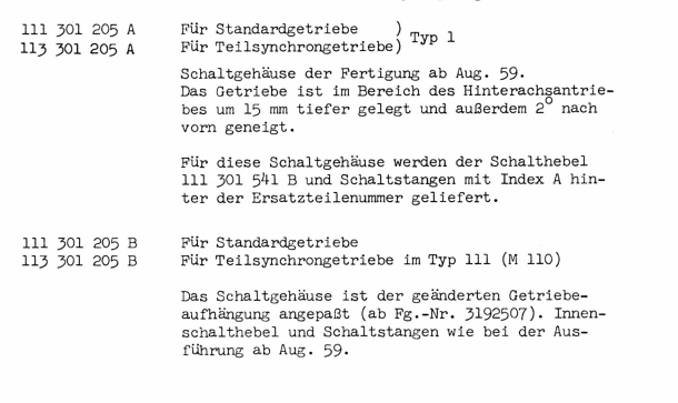 Die Änderung ab 1959 hat ja aber auch das vollsynchron Gehäuse mit sich gebracht, oder liege ich da falsch? In dem Wagen ist ja ein geteiltes, teilsynchron drin und da wurde ja das Gehäuse nicht geändert, oder? Ab 59 gab es dann das verstärkte einteilige Getriebegehäuse mit den beschriebenen Änderungen an Neigung und Achshöhe. Aber möglicherweise ist da ja mein Denkfehler.