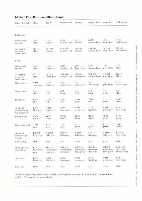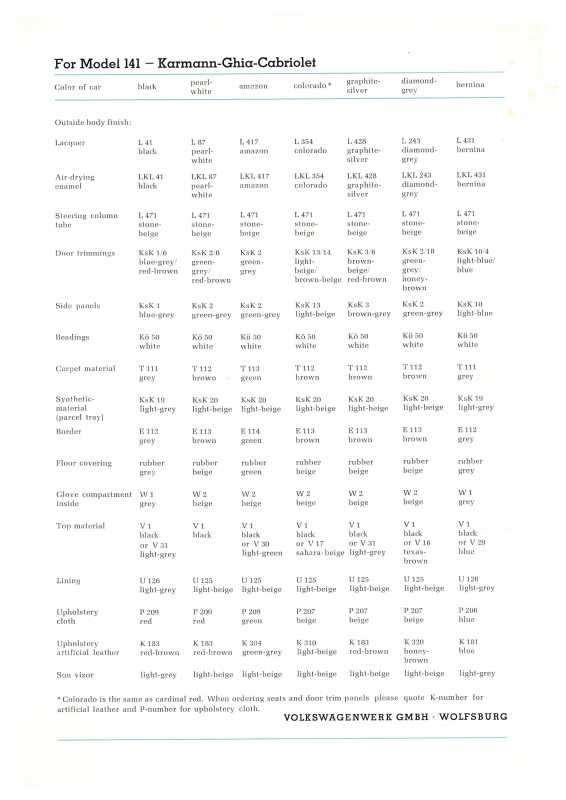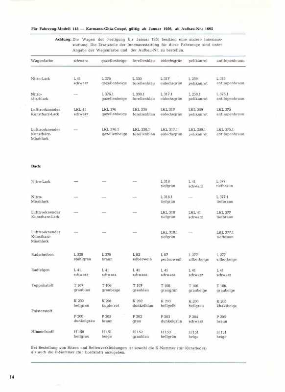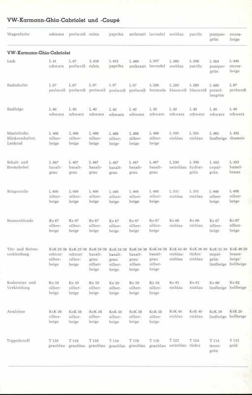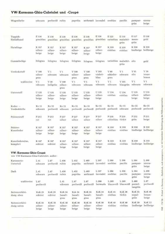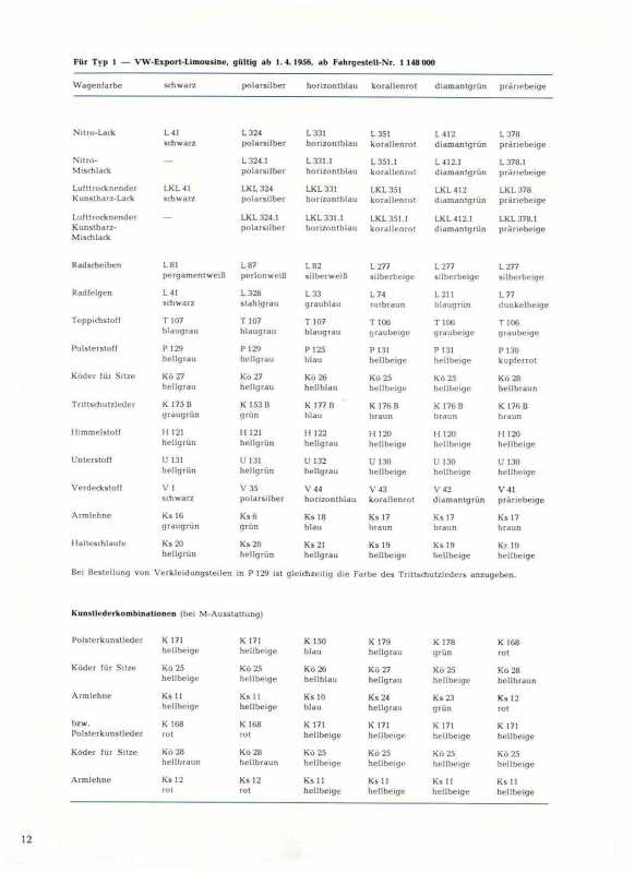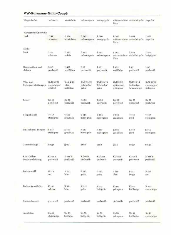 Ich beschäftige mich gerade mit Innenausstattungen der frühen Ghias und den Möglichkeiten Sonderwünsche bezüglich Farben der Karosserien und Innenausstattungen. Auch 1956 wurden schon Sonderwünsche bei Karmann realisiert. Meine Frage an Euch: Wer hat eine Liste mit den Farbkombinationen fürs Fahrzeug und den Innenausstattungen zum VW Käfer Cabrio 1956? Das Farbarchiv ist hier ja noch geschlossen. Speziell suche ich nach hellen Leder- oder Kunstlederfarben, Richtung weiß. gab es das? Grüße, Udo Dreisörner