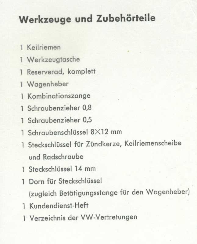 Glühbirnenbox, Regler, Reservekanister, Gaszug, Kupplungszug, Lichtmaschinenkohlen, Vergaserdichtungssatz, Ventildeckeldichtungen, Bordwerkzeug, Fühlerlehre , Motoroel.