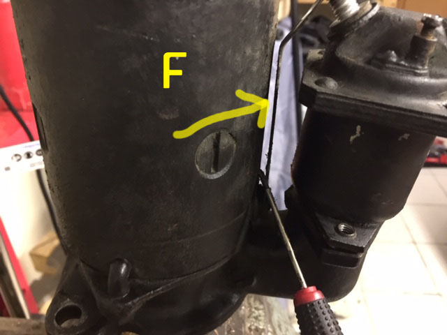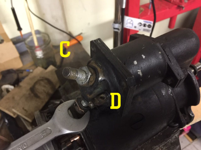 Der Magnetschalter ist im Prinzip wie ein Arbeitsrelais. Wenn du den Zündschlüssel betätigst, schaltest du Strom via Kabel 3 auf Anschluss D. Durch das erzeugte Magnetfeld wird via einem Hebel die Ritzelwelle ausgefahren und gleichzeitig Strom von Kabel 1 über Anschluss C auf Metallband F gegeben. Der Anlasser dreht sich.
