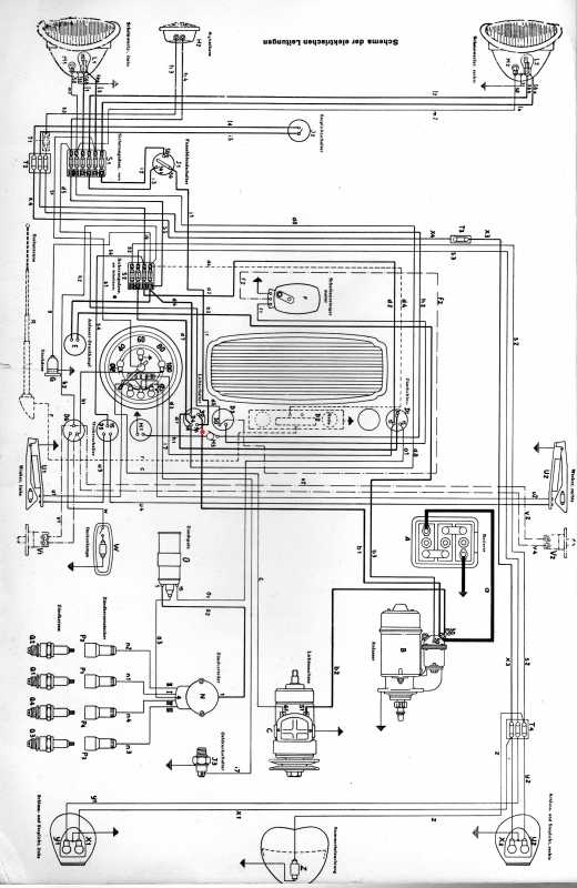 Wenn es noch kein kombiniertes Anlass-/Zündschloss gab geht der 6,0 mm2 Draht vom Anlasserklamme 30 (= wo auch der Batteriekabel ist) nach vorn, direkt nach Lichtschalter Klamme 30. ALLE Verbraucher werden hier gemessen (roter O im Schaltbild 1953). Das heist aber: AUCH den Magnetschalter-Strom beim Anlassen!