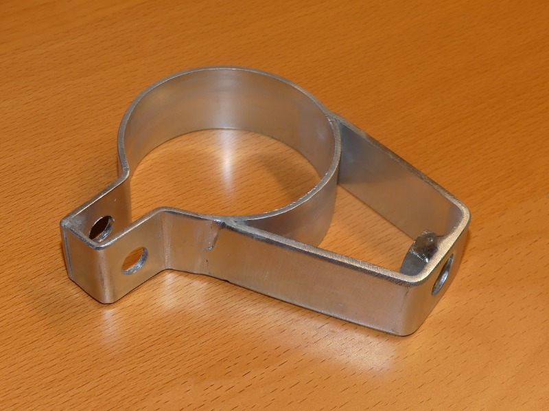 Meinen Halter hatte ich am CAD konstruiert und das auf einer CNC Plasmaanlage geschnitten. Kann aber nicht jeder. Alternativ hätte man den Anschweisshalter vom Veteranenservice mit zwei Langlöchern versehen können und dann mit einer Bügelschelle befestigen.