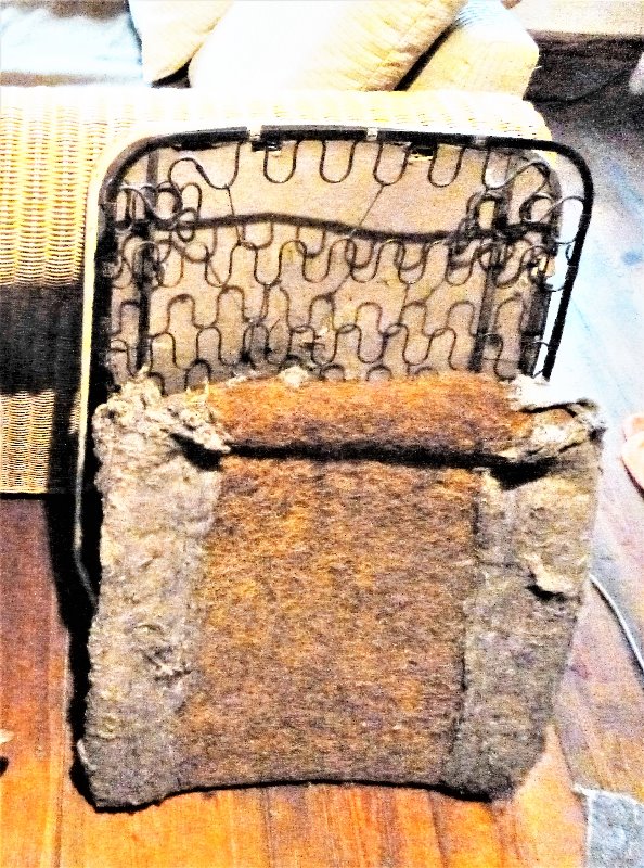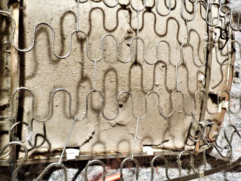 Meine Ersatz-Presspappen habe ich am Rahmen des Federkernes fixiert, Aussparungen, wie bei den dünnen Pappen habe ich mit Ergänzungsstreifen oben und unten umgangen, so dass trotzdem der Rücken zum Federkern hin vollständig abgedeckt wurde.