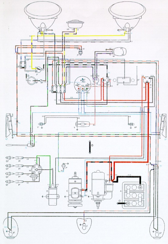 Das 1954 Schaltbild vom Reparaturleitfaden ist zwar sehr ähnlich zu das von Andrew gezeigte, aber es gibt kleine Unterschiede. z.B. die Abzweigung zur Abblendlicht rechts (gelb) wird als 2,5 mm2 angegeben.