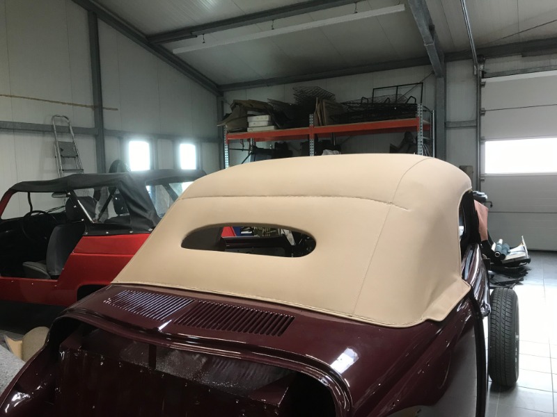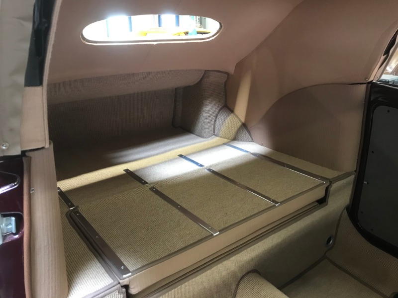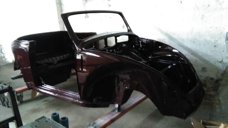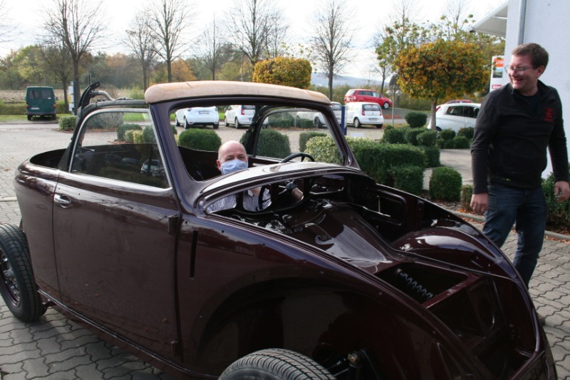 Hallo Hebmüller Freunde,die Restauration geht in die Endphase.Ralf Düllmann hat eine tolle Arbeit abgeliefert. Da blieb bald kein Blech unberührt. Das wäre weit über meine Fähigkeiten gegangen. Selbst das gut aussehende Fahrwerk wurde von unten geöffnet um der braunen Pest Herr zu werden. Das habe ich dann bei mir rollfähig gemacht.Da ich etwas mehr Leistung haben soll wurde das Fahrwerk optimiert.Umbau auf Hydraulik damit eine 356 B Bremse montiert werden kann. Da ich vorhabe oft und weit damit zu verreisen habe ich vorne und hinten Federn wie sie ca. 1960 bis 1965 Serie waren verbaut. Hinten ist das einfach nur ein Tausch und passender Einstellung. Vorne habe ich eine neuere Vorderachse mit Seitenschilden von 1950 versehen. Die Optik ist 1950,die Nüsse haben die richtige Gradzahl für die weicheren Federblätter.Man wird halt älter.Ein Lenkungsdämpfer wie man ihn ab ca 54 zum Nachrüsten bekam und ein 14mm Stabilisator für die Kurvenfreude ergänzen das Konzept.Als erster Motor kommt ein auf 1300ccm gebrachter penibel aufgebauter 30PS Motor mit aktiverer Nockenwelle zum Einsatz.Ölfilter und Drehstabölkühler sollen alles im grünen Bereich halten. Einen 28PCI Vergaser habe ich auf 30mm vergrößert. Als Felgen kommen 4 1/2" x 15 vom 356 er mit 165 er Reifen zum Einsatz. Da träume ich noch von den 356er 16" in 4 1/2" . Die schmalen Varianten finde ich für mein Projekt zu schwach.Das Häuschen wurde in L51 bordeaux rot lackiert und noch letztes Jahr Hochzeit gefeiert. Seitdem liefert der Sattler Bokemeier in Rothenuffeln sein Schärflein dazu bei das es ein Schmuckstück wird.Die heutigen Bilder habe ich zum Anlass genommen den Zwischenbericht vorzustellen.GrußHans Müller-Daum