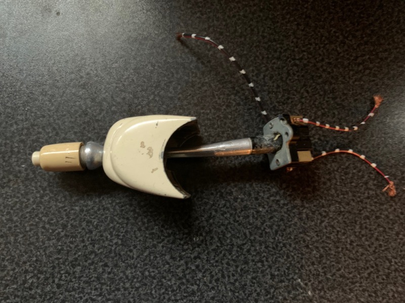 Einer hat eine rote Lampe am Hebelende,der andere einen Drucktaster wobei man den Hebel auch noch zu sich ziehen kann.Bei einem dritten wurden die Kabel der Druckknopfbetätigung an H und einem der beiden Nieten die den Schalter zusammenhalten professionell an spezielle Messingunterleger angelötet. Die Anschlüsse haben hier die Bezeichnungen L R H + Zusätzlich ist an dem Gehäuse eine Klemme für einen Masseanschluß genietet.