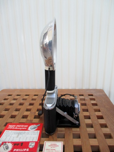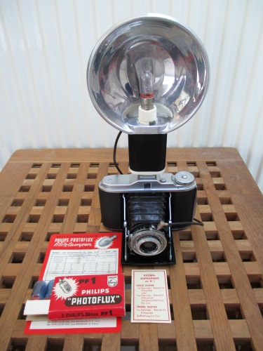 Des Weiteren wurde vom Vorbesitzer als zeitgemäßes Zubehör der damaligen Zeit ein neuer Fotoapparat angeschafft, Typ: AGFA Isolette V von 1950 mit separatem Blitzer. Hier muss man alles noch manuell einstellen (Entfernung, Belichtung und Blende). Auch für diese Geräte gibt es heute noch Mittelformatfilme, separate Blitzerbirnen und neue 22,5 Volt Anodenbatterien zum Aufladen des Blitzes. Ab und zu mache ich ein paar Bilder damit und es ist immer interessant, zu sehen, wie viele Leute sich noch für diese alte Technik interessieren. Man kann diese Geräte noch relativ günstig im WWW erwerben.
