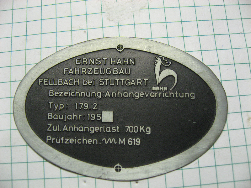 Hier mal noch ein Foto des fabrikschildes der Hahn Einrohrkupplung. Die habe ich an meinem VW 82 verbaut,weil es keine Möglichkeit der Befestigung an der Stoßstange gab.