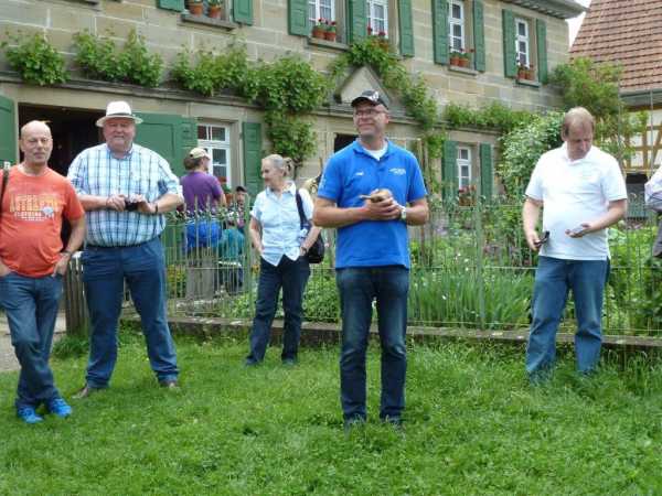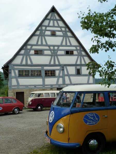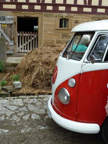 Am nächsten Tag startete dann recht früh die große 5-Täler-Fahrt. Hierzu gab es ein Roadbook mit Chinesenzeichen, wie ich es selten gesehen habe. Jede Kreuzung und Abzweigung war detailliert mit Hinweisen auf Sehenswürdigkeiten, Blitzampeln (!) und Tankstellen beschrieben und dies in einer so guten Darstellung, die es auch mir als Fahrer ohne Beifahrer ermöglichte, sich immer zurecht zu finden. Ich möchte nicht wissen, wie viel Stunden allein in dieser Unterlage stecken, zumal sich die Ausfahrt über den ganzen Tag und ca. 150 km in 4 Etappen erstreckte. Immer wieder gab es zwischendurch Pausen, so z.B. in einem Landgasthof, in einem Freilandmuseum und in der historischen Altstadt von Vellberg. Und hinzu kam, dass wir weiterhin wie auf der Hinfahrt bestes Wetter hatten, so dass die Verdecke unserer VW zumeist offen waren. Abends konnten wir dann auch alle gemeinsam im Biergarten bei angenehmen Temperaturen essen.