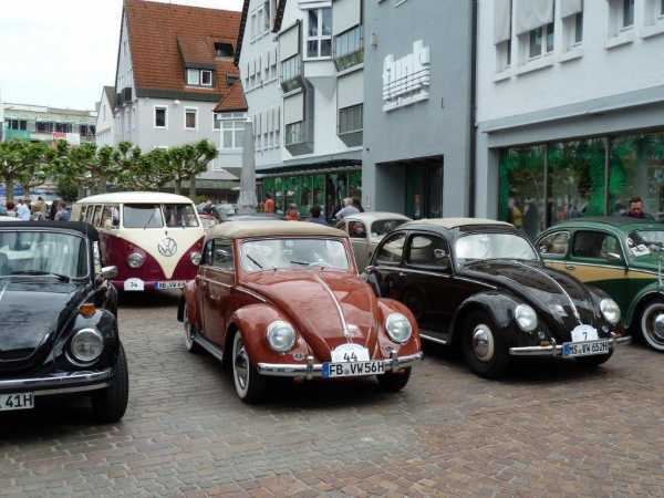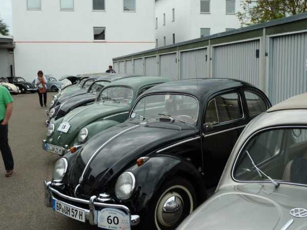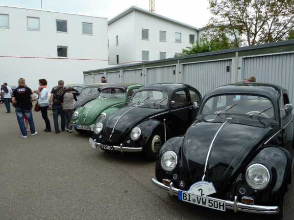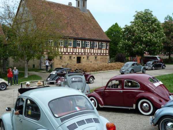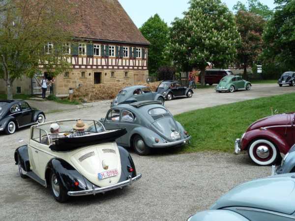 Aber der Reihe nach: es begann mit einer gemeinsamen Anreise mehrerer Mitglieder von unserem Stammtisch Untermain. Insgesamt mit sieben Autos waren wir unterwegs, eine bunte Mischung von drei Brezelkäfern (davon einer mit historischem Umbau zum Pick-up) allesamt mit 24,5 PS, ein T1, ein Käfer-Cabrio Bj. 56 und zwei Karmann-Ghias. Somit also eine Sammlung schöner VWs, die für einiges Aufsehen (und einen etwas gebremsten Verkehrsfluss….) bei der Anreise während des Feiertages über Landstraßen sorgten. Da es vom Treffpunkt in Obernburg aus nur ca. 180 km zu fahren waren, hatten wir unser Hotel in Aalen schon gegen ca. 15:00 h erreicht.