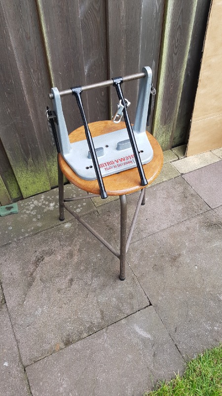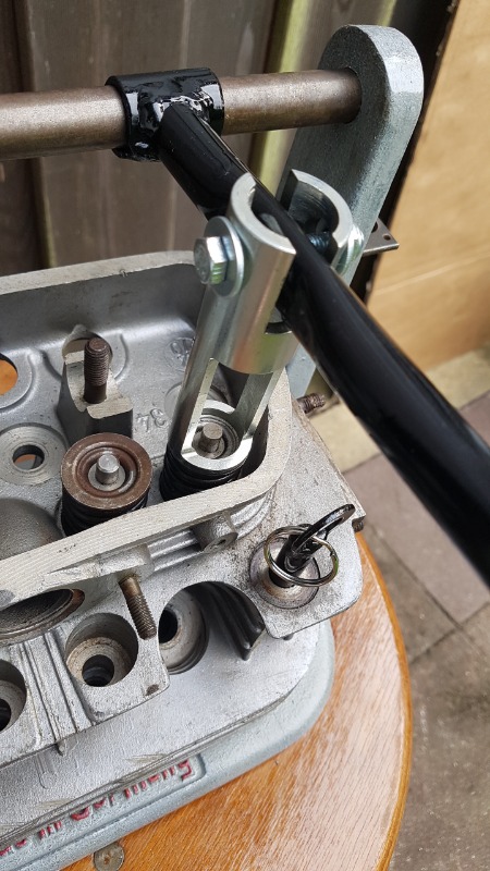 den Kurbelwellenhalter habe ich in HO liegen gelassen. Ventilfedern drücke ich in der Ständerbohrmaschiene mit einem simpel angertigten Teil das aus einem Ring der auf der Feder aufliegt und mit angeschweißtem Draht zum Bohrmaschienenfutter führt. Mit einem Stabmagneten hole ich die Keile raus. Unter den Ventilen liegt ein kleines Holzklötzchen.