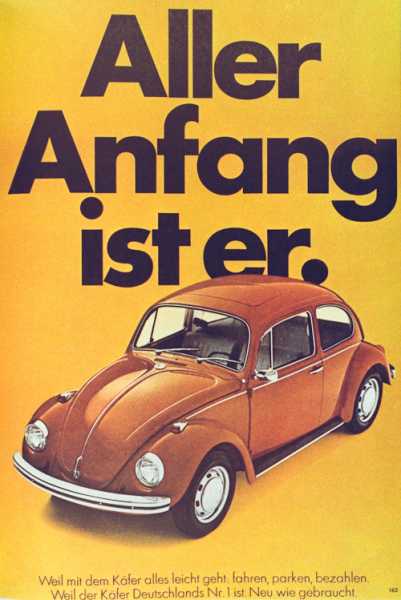 In diesem Zusammenhang bin ich auf der Suche nach dem Plakat „Aller Anfang ist er“ aus den 1960er Jahren, mit dem Volkswagen für den Käfer geworben hat (Abbildung im Anhang). Gerne würden wir das Plakat in der geplanten Ausstellung zeigen, haben bislang aber lediglich ein Foto des Motivs erhalten können. Auch das das Volkswagen-Archiv kann nichts anderes anbieten. Ich wende mich daher in der Hoffnung an Sie, dass sich das Plakat in einer Ihrer Sammlungen befindet und Sie es uns eventuell als Leihgabe zur Verfügung stellen könnten.