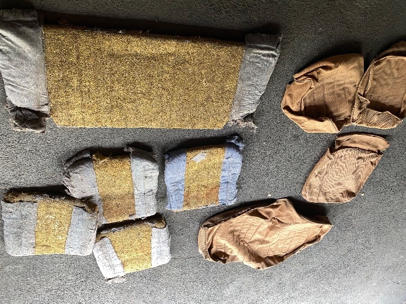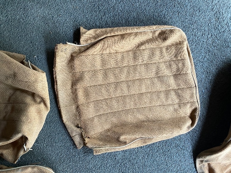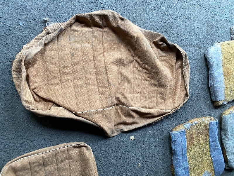 OVALI alte rötliche Sitzbezüge mit Pünktchen und Beschädigungen und alte Polster von beiden vorderen Sitzen und von der Rücksitzbank.