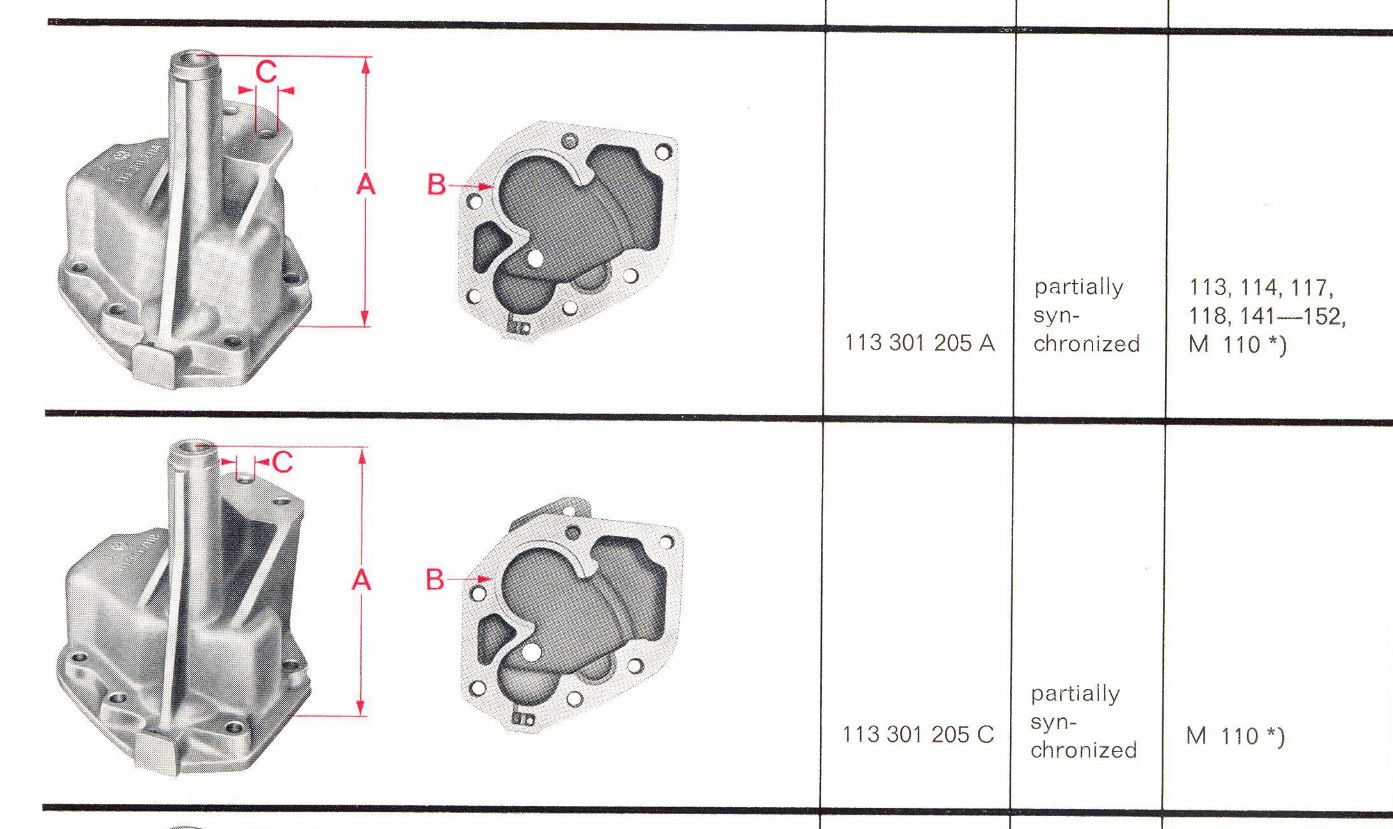 Ausserdem gibt Der Berater bei 113 301 205C die Note "M110 *" , nur für Kanada. . Das war in 1962 ein Kanadisches Standard-Modell mit hydraulischen Bremse und :"synchromesh gears". Nicht viel später wurde M110 (Kanada) umschrieben als "full synchromesh". Könnte es sein, das anfangs noch das TEILsynchrongetriebe geliefert wurde? Nur eine Vermutung, leider....