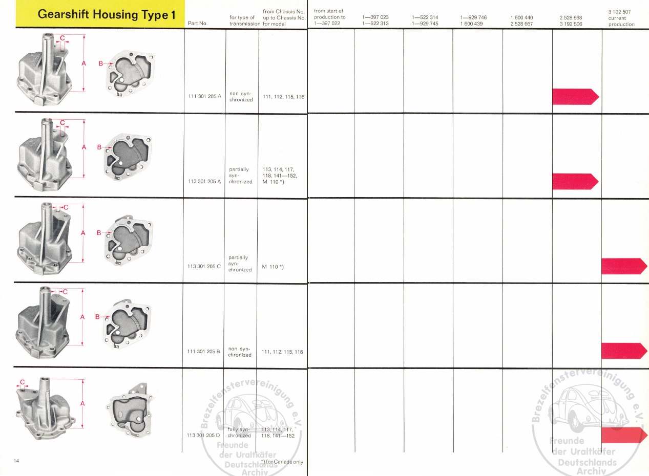 Das Schaltgehäuse 113 301 205 A wurde erst notwendig, wenn ab FG 2 2528 668 das Motor-Getriebe-Aggregat um 2 Grad nach vorn geneigt wurde. Es gab derzeit noch kein Vollsynchrongetriebe im Käfer.Ab diesem Zeitpunkt kam auch für das Teilsynchrongetriebe das Schaltgehäuse 205 A. Wieso wurde das Schaltgehäuse nach einem Jahr dann wieder geändert zu dem Gehäuse 205 C.