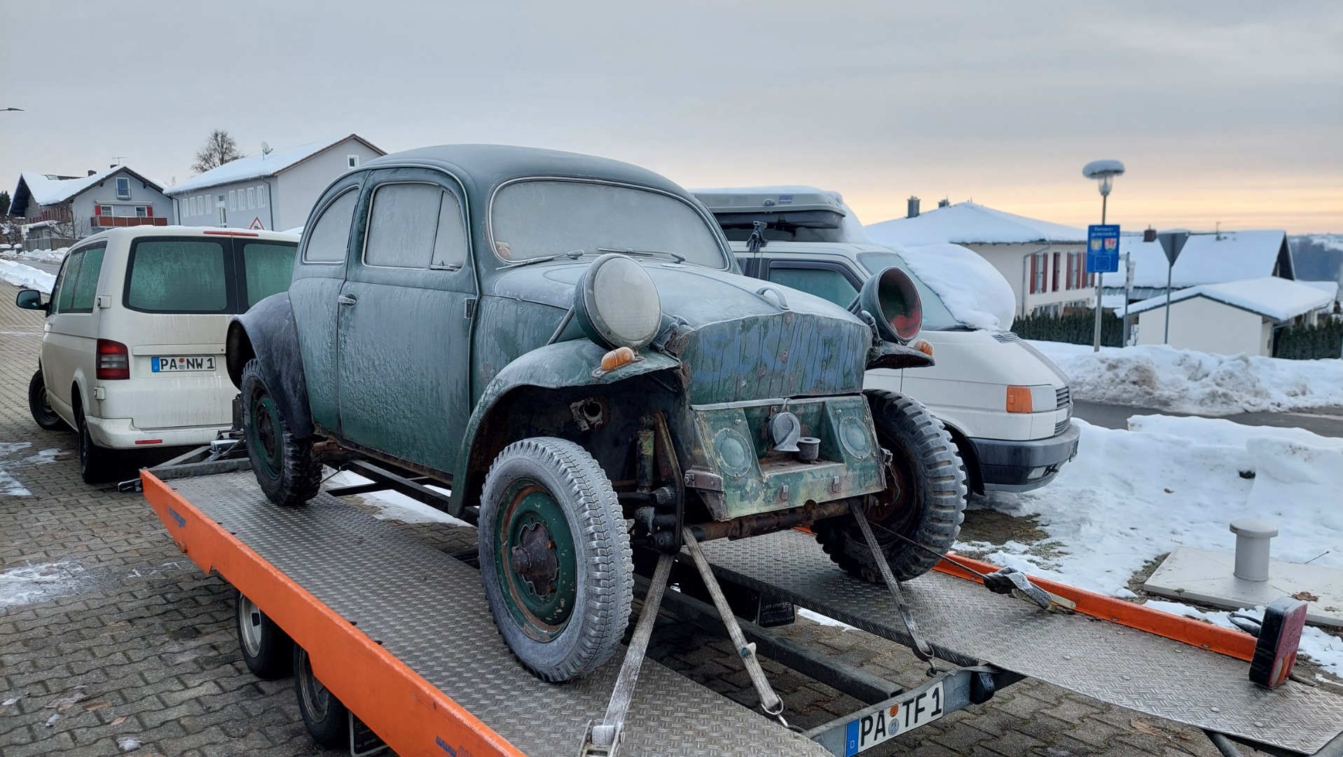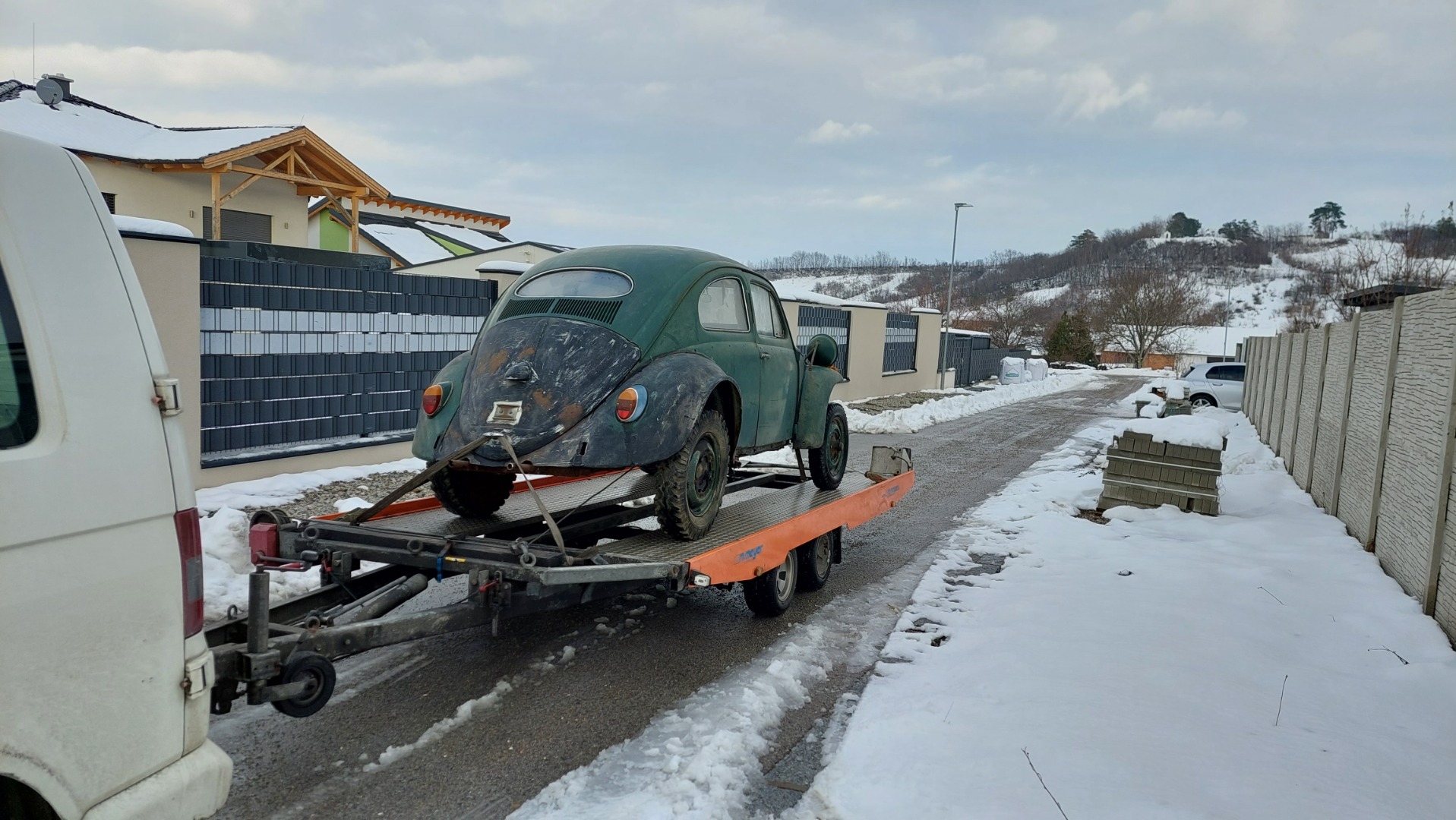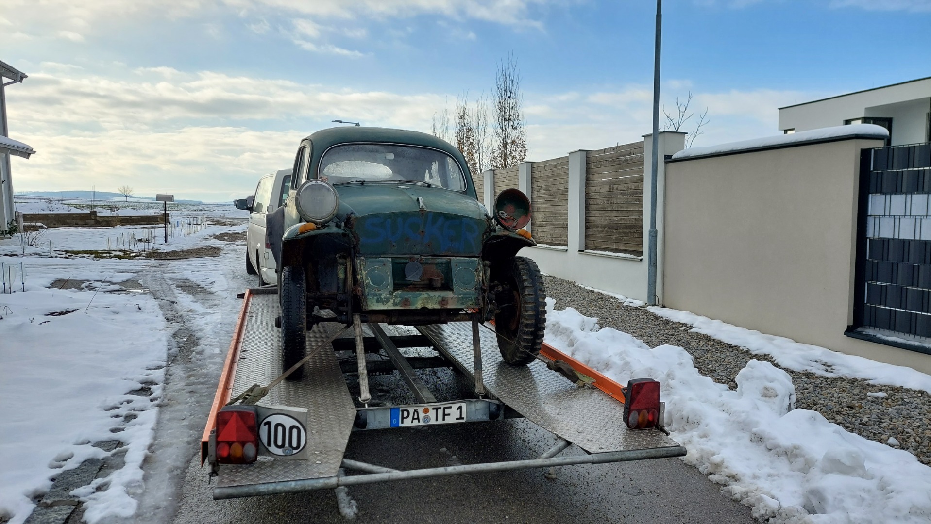 Mein letzter Einkauf war einer der 54er der mit Barndoor Teilen aufgebockt wurde. Der kleine wurde seiner Nase beraubt, damit der Böschungswinkel quasi nicht mehr vorhanden war. Sieht etwas wild aus, ist aber vom Blech in verhältnismäßig gutem Zustand. Gerade bin ich dabei das Auto fahrbar zu machen.