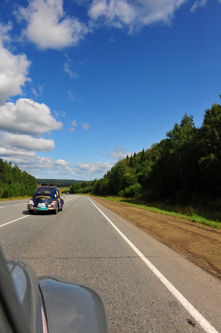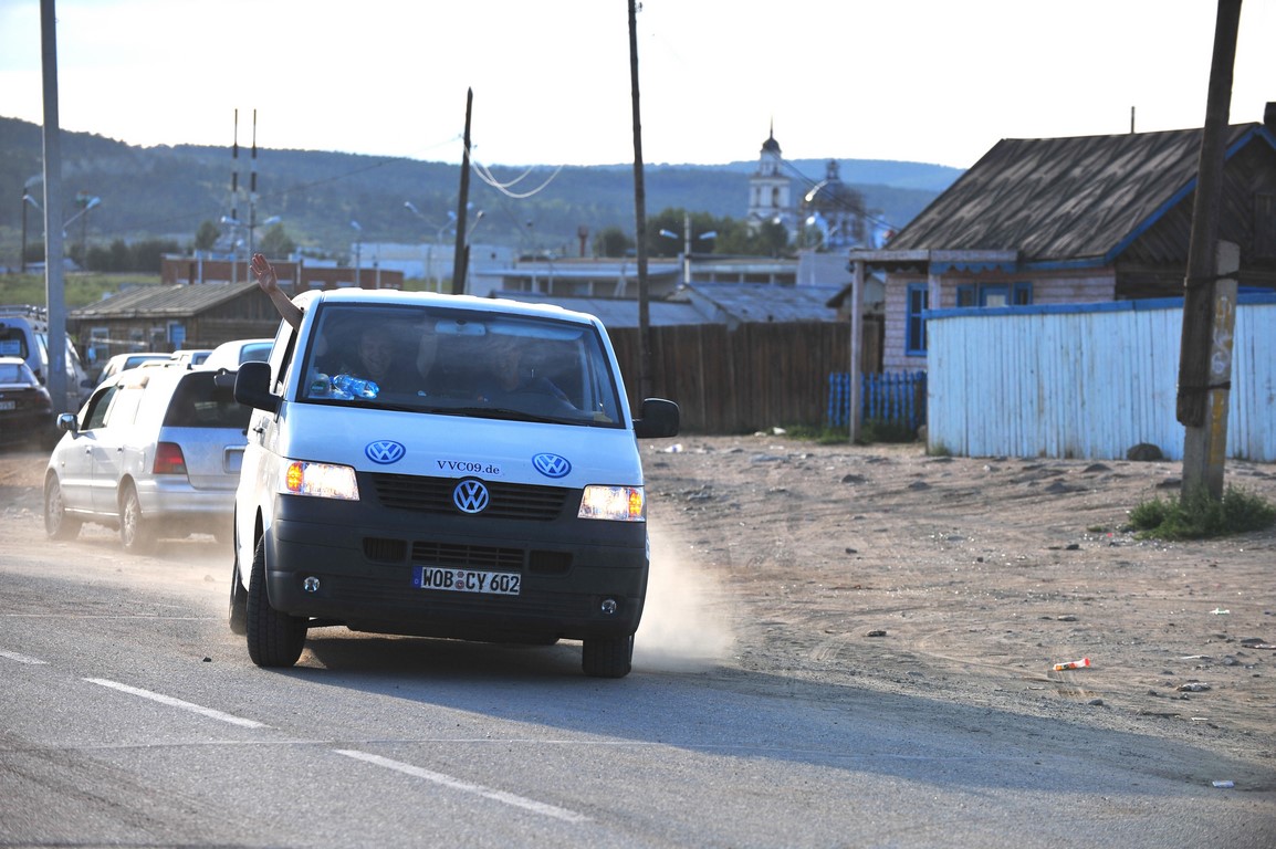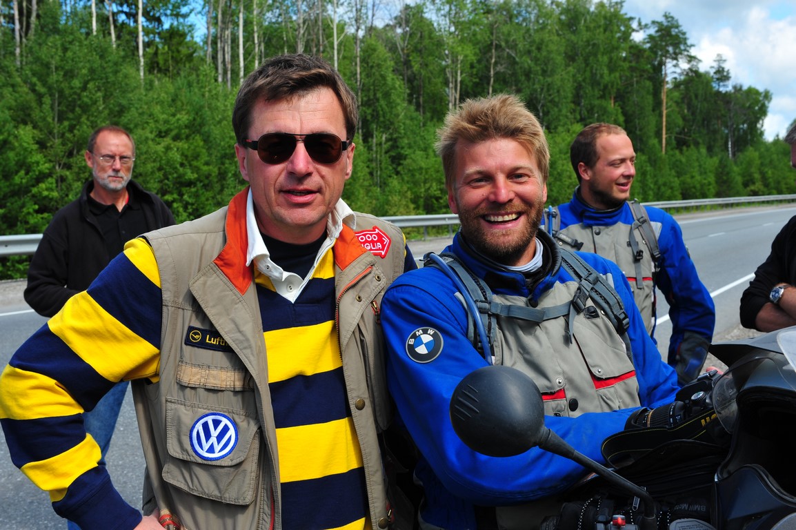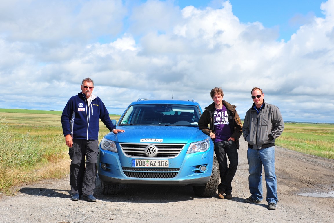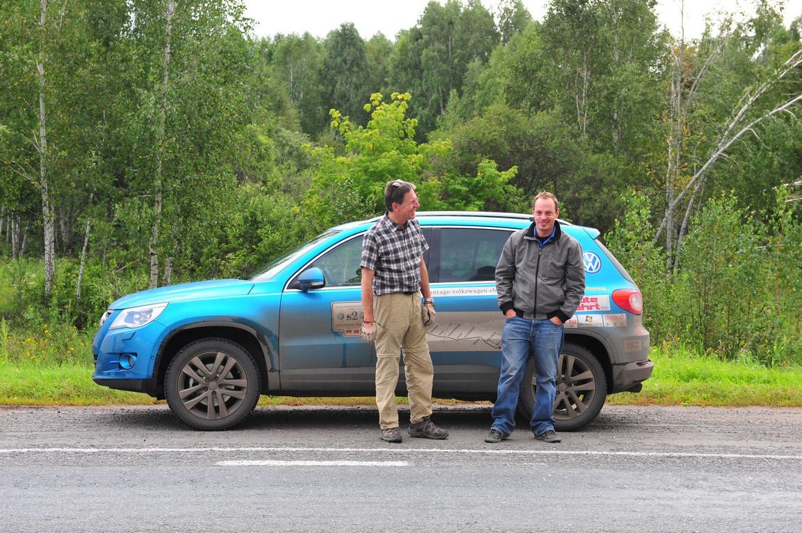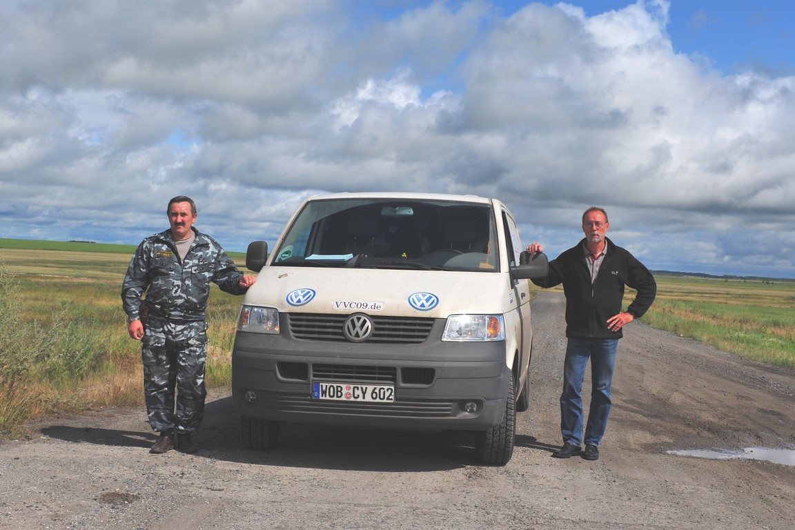 Volkswagen stellte uns als Hauptsponsor zwei neue Servicefahrzeuge bereit, einen T5 Kastenwagen und einen Tiguan. Egon Ziebold sollte als Servicefachmann vom VW-Werk den T5 fahren und uns im Falle von Problemen auch entsprechend helfen. Dazu hatte er im Laufe der Reise auch jede Menge Möglich-keiten. Mit im T5 fuhr Thomas Weikert, neben Alex der zweite Youngster im Team. Egon und Thomas wurden durch den unfreiwilligen Aufenthalt im Zoll an der lettisch-russischen Grenze als Team zusammengeschweißt. Zwischenzeitlich musste Thomas unserem russischen Begleiter Sascha weichen, der uns vom Russischen Zoll an die Seite gestellt wurde, um den T5 sicher durch Russland zu geleiten. Der T5 war übervoll beladen mit Ersatzteilen, zwei kompletten Ersatzmotoren, einem Ersatzgetriebe, Kanistern, Koffern und allerlei zusätzlicher Gebrauchsgegenständen. Er war ein sehr zuverlässiges Fahrzeug und blieb nur einmal im Sand der