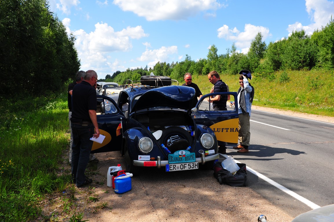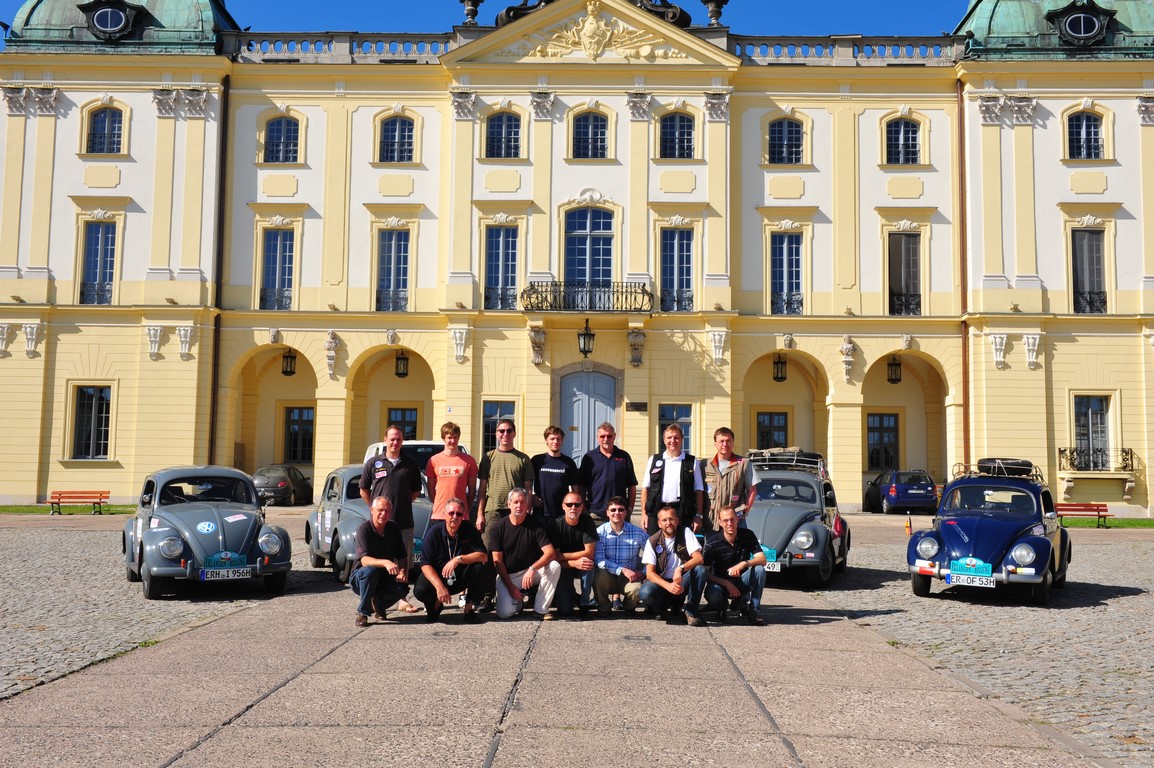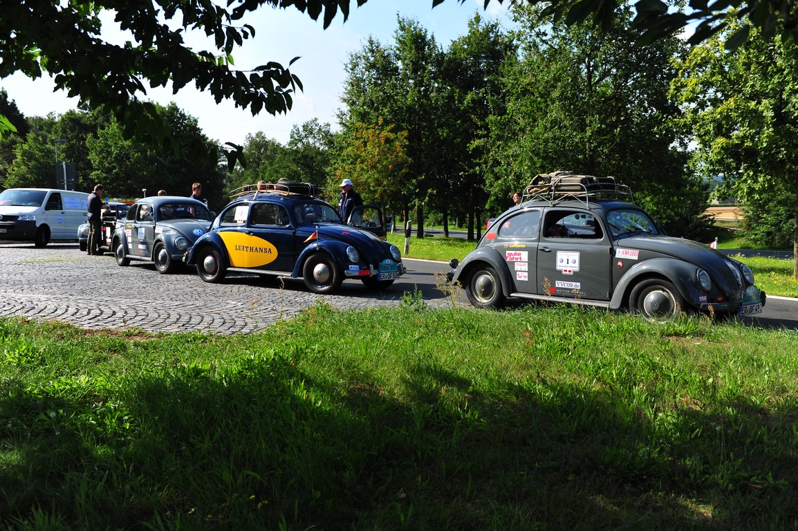 Eine kleine Anekdote ereignete sich bereits am Schlossplatz: Claus sollte als letzter mit dem Tiguan losfahren, alle Käfer waren schon in der Hauptstrasse, aber die Handbremse am Tiguan ließ sich nicht lösen! Es wurde schon langsam peinlich für ihn, denn ca. 300 Schaulustige sahen zu, wie er ratlos mit hochrotem Kopf hinter dem Steuer saß und einfach nicht loskam. Irgendwann wurde ihm dann klar, dass sich die Handbremse nicht lösen ließ, da er nicht angeschnallt war. Schöne neue und automatisierte Autowelt!