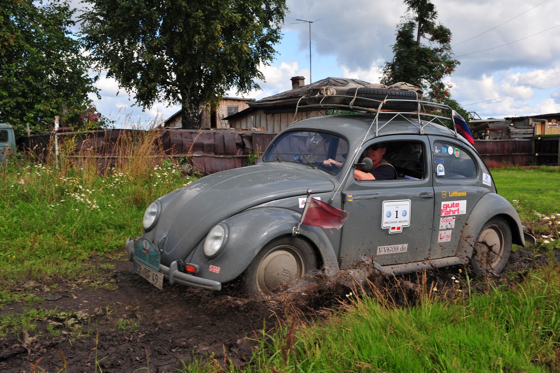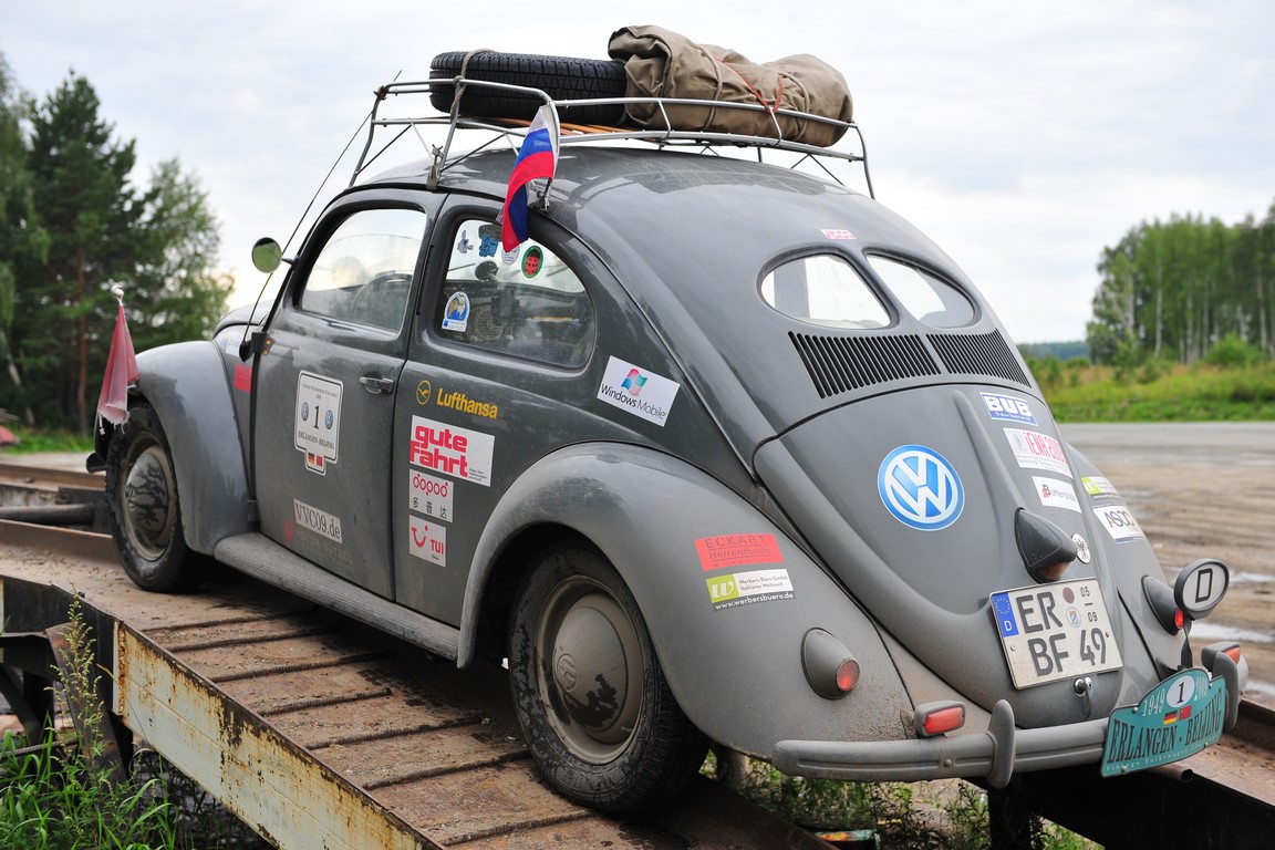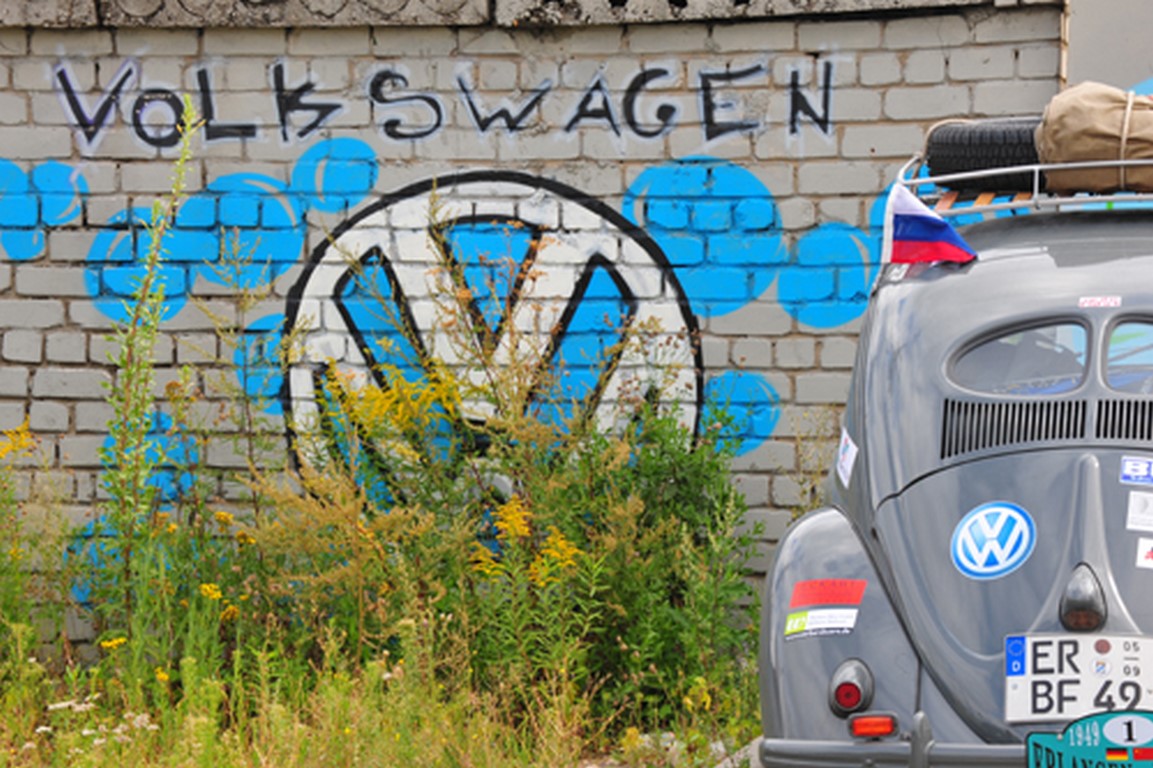 Der Brezel hat eine interessante Vergangenheit, die mir in den wichtigsten Zügen bekannt ist. Verkauft wurde er im Jahr 1949 als einer der ersten Volkswagen vom neu gegründeten Volkswagenhändler Zinkl in meiner Heimatstadt Amberg. Der erste Besitzer war ein Arzt aus Schnaittenbach, mit dessen Sohn ich noch im Kontakt bin und der mir auch alte Fotos zur Verfügung gestellt hat. Der Käfer machte in den frühen 50er Jahren einige Fahrten nach Italien. Es soll sich damals folgendes Ereignis zugetragen haben: Als der fast wehrmachtsgraue Käfer durch ein nord-italienisches Dorf fuhr, bekreuzigte sich eine ältere italienische Mama am Straßenrand mit den Ausruf: „Oh Gott, die Deutschen kommen wieder!“. Dies ist uns in Polen und Russland nicht passiert, denn die vielen Sponsoraufkleber gaben den 49er Käfer doch eindeutig als Rallyefahrzeug zu erkennen.