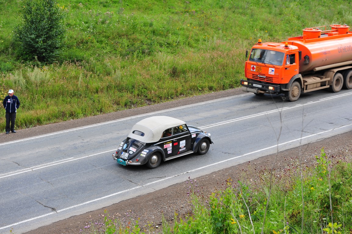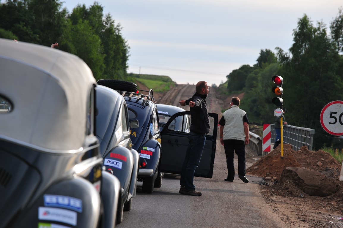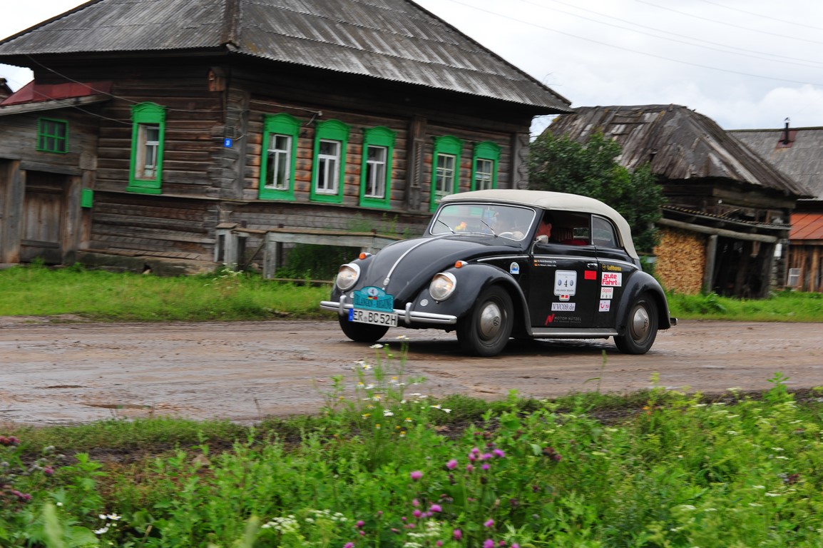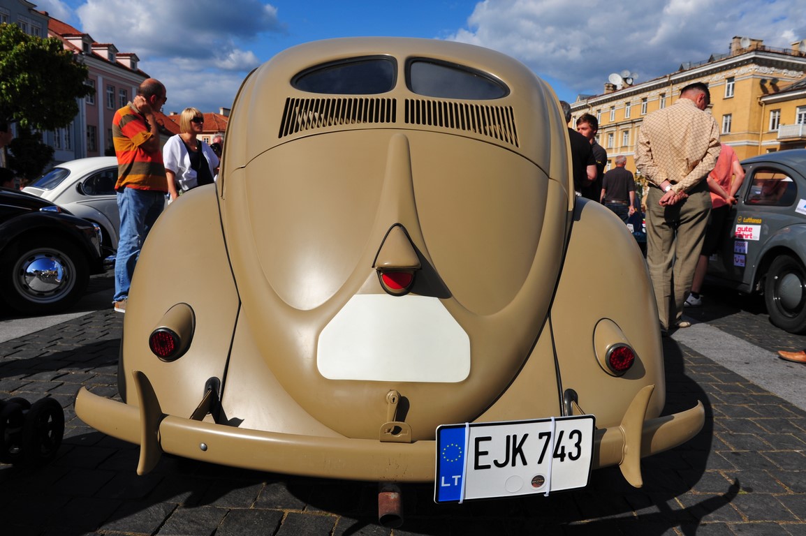 Der Brezel hat eine interessante Vergangenheit, die mir in den wichtigsten Zügen bekannt ist. Verkauft wurde er im Jahr 1949 als einer der ersten Volkswagen vom neu gegründeten Volkswagenhändler Zinkl in meiner Heimatstadt Amberg. Der erste Besitzer war ein Arzt aus Schnaittenbach, mit dessen Sohn ich noch im Kontakt bin und der mir auch alte Fotos zur Verfügung gestellt hat. Der Käfer machte in den frühen 50er Jahren einige Fahrten nach Italien. Es soll sich damals folgendes Ereignis zugetragen haben: Als der fast wehrmachtsgraue Käfer durch ein nord-italienisches Dorf fuhr, bekreuzigte sich eine ältere italienische Mama am Straßenrand mit den Ausruf: „Oh Gott, die Deutschen kommen wieder!“. Dies ist uns in Polen und Russland nicht passiert, denn die vielen Sponsoraufkleber gaben den 49er Käfer doch eindeutig als Rallyefahrzeug zu erkennen.