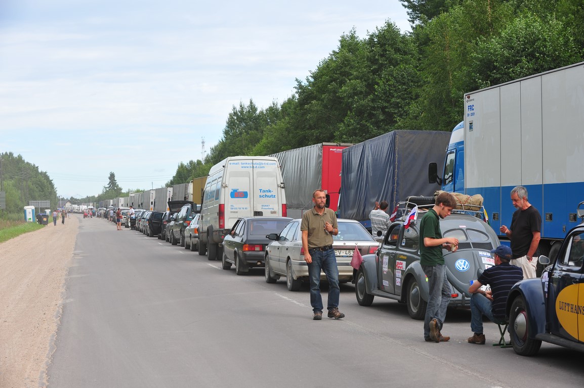 Wir kamen kurz nach ein Uhr am frühen Nachmittag an der Grenze an. Dort herrschte zwar kein allzu großer Andrang, aber es war etwas unklar, wo man sich anstellen sollte und wann das Tor sich für wen wieder öffnen würde. Heinrich und Waldemar saßen bei mir im 49er. Nichts bewegte sich am Tor und Heinrich wurde es zu dumm. Er sondierte am Grenztor herum und fand tatsächlich einen Ansprechpartner durch den Zaun und wir konnten nach kurzer Verhandlung als Team wie ein Wunder vorfahren und gelangten nach etwas mehr als 30 Minuten in den russischen Zollbereich. In der Zwischenzeit hatte sich Waldemar zu Egon in den Service T5 gesetzt, damit ein russisch sprechender Beifahrer bei Egon ist, falls es wieder Probleme geben sollte. Das war eine gute Entscheidung.