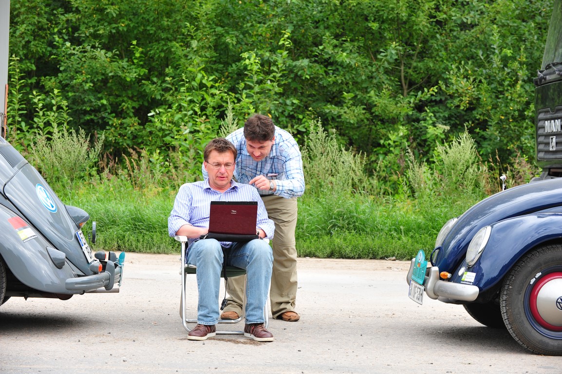 Nur einmal kam es zu einem Eklat, der dann doch sein Mitwirken nötig machte. Bernd, der in China das Siemens Healthcare-Geschäft leitet und den ich schon viele Jahre kenne, gestand mir bei der zweiten Ausfahrt vor unserer Rallye, dass er noch nie einen Käfer gefahren hätte. Das behielt ich dann doch für mich und erzählte es dem Team nicht weiter. Inwieweit diese Tatsache dem Cabriogetriebe zu schaffen machte, bleibt erstmal im Alugehäuse des Brezelgetriebes verborgen, bis der Heinrich dann dieses einmal überholen wird. Beide verstanden sich auf Anhieb sehr gut. Auf der Strecke sah man sie immer wieder das Verdeck auf- und wieder zumachen. Den Solariumeffekt habe ich mir im Rahmen der Nutzungsgebühr übrigens nicht erstatten lassen. Neben der Tatsache, dass die