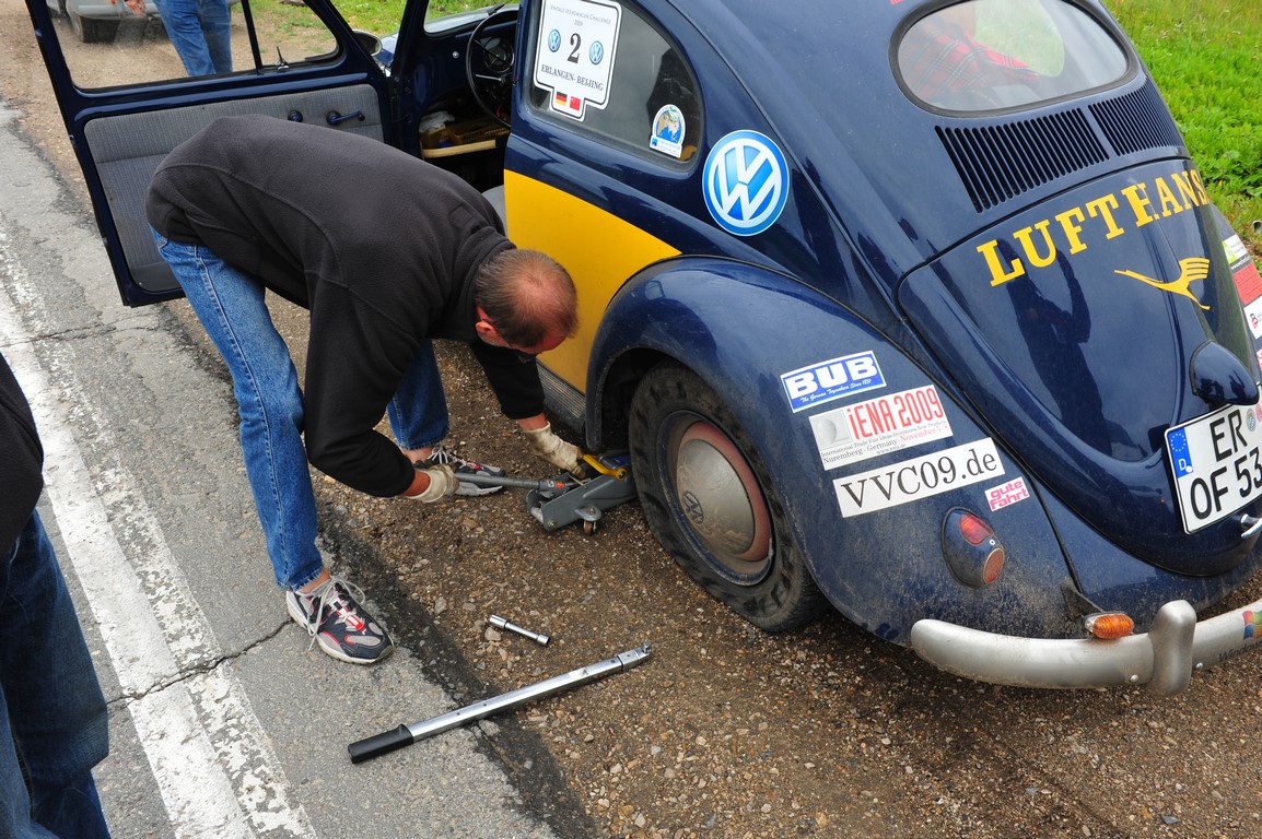 Kurz hinter dem Bamberger Kreuz fehlte plötzlich der Appleton-Käfer. Wie sich herausstellte, hatte er das hintere Rallyeschild verloren. Ja, auch selbstsichernde Schrauben muss man anziehen! Das war sozusagen einer der ersten „Appletons“. Es sollten noch einige folgen ...