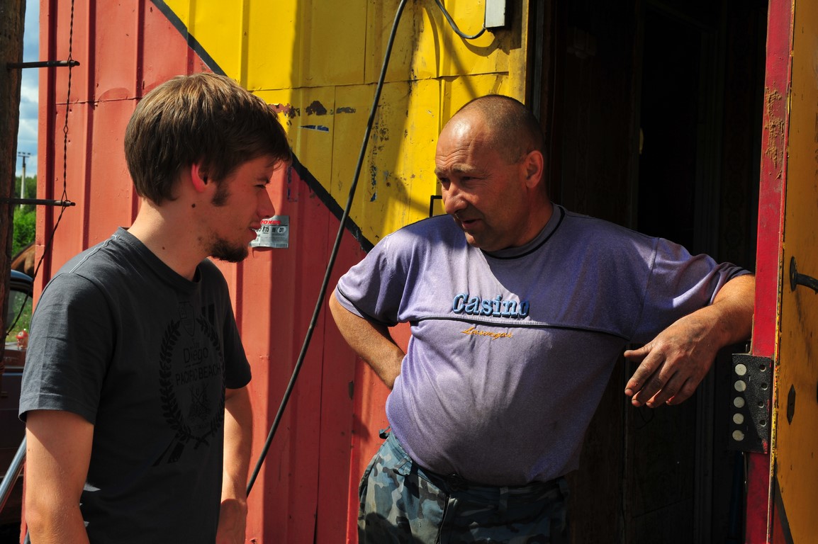 Die Nacht zurück in Irkutsk war aufregend, weil die Ersatzteillieferung alles andere als sicher war und ich konnte deshalb wenig schlafen. Zunächst rief mich Egon gegen Mitternacht an und teilte mir mit, dass die Teile von VW Klassikparts in Moskau hängen geblieben waren. Damit war Heinrich unsere letzte Hoffnung, dass er es mit seinen zwei Torsionsstäben nach Irkutsk schafft. So gegen 2 Uhr nachts rief mich Heinrich dann aus Moskau an: Er sei durch den Zoll und steige nun in den Flieger nach Irkutsk um, mit seinem Gepäck. Das war gute Nachricht und ich konnte etwas einschlafen. Am Morgen fuhren wir erstmal zur Werkstatt, in der mein 49er stand und bereiteten alles für den Einbau der beiden Torsionsstäbe vor. Wir entschlossen uns, unsere Autos zu waschen und Egon reinigte den T5 gleich in der Werkstatt. So gegen 10:30 Uhr fuhr mich Alexey (der Geschäftsführer der Werkstatt) zum Flughafen, um Heinrich abzuholen. Ich hatte bereits online gecheckt, dass der Flieger aus Moskau pünktlich sein würde. Die Erleichterung war gross, als Heinrich rauskam, noch grösser, als sein Koffer mit der kritischen Ware auch angekommen war. Dann sofort zur Werkstatt und innerhalb von 45 Minuten waren die beiden Torsionstäbe eingebaut und der Wagen wieder fahrbereit.