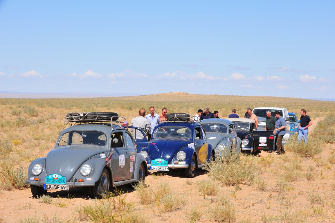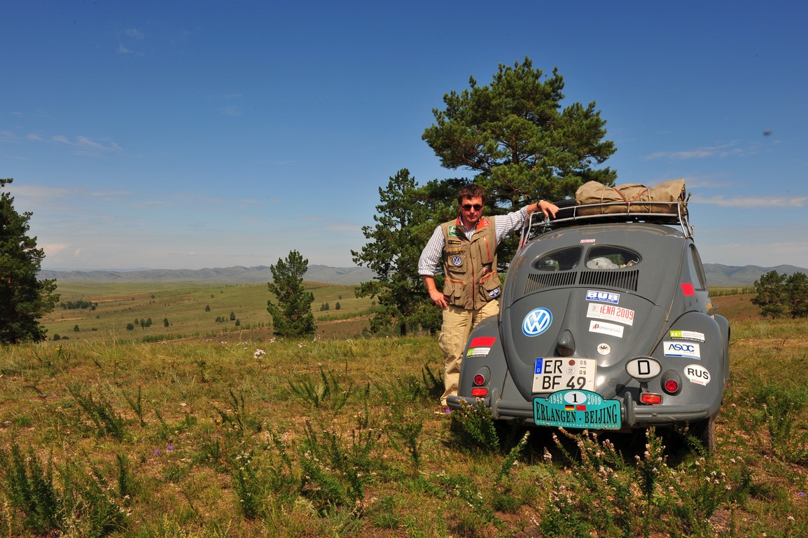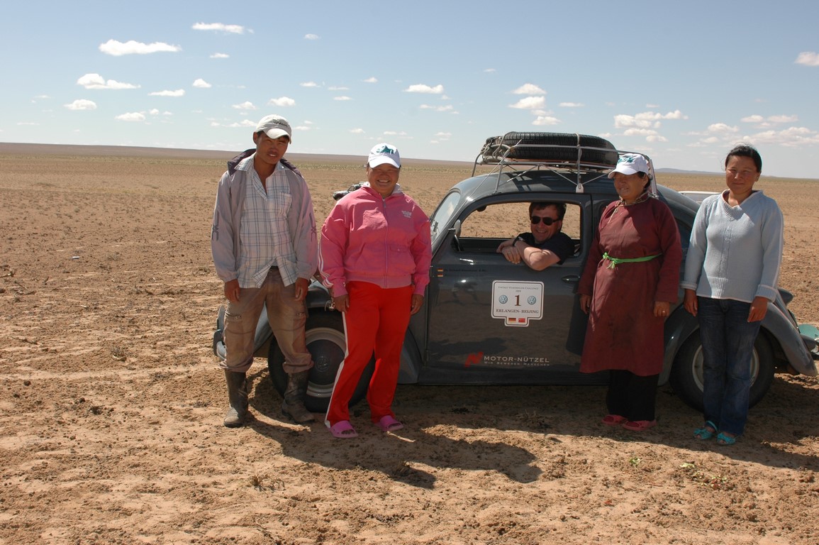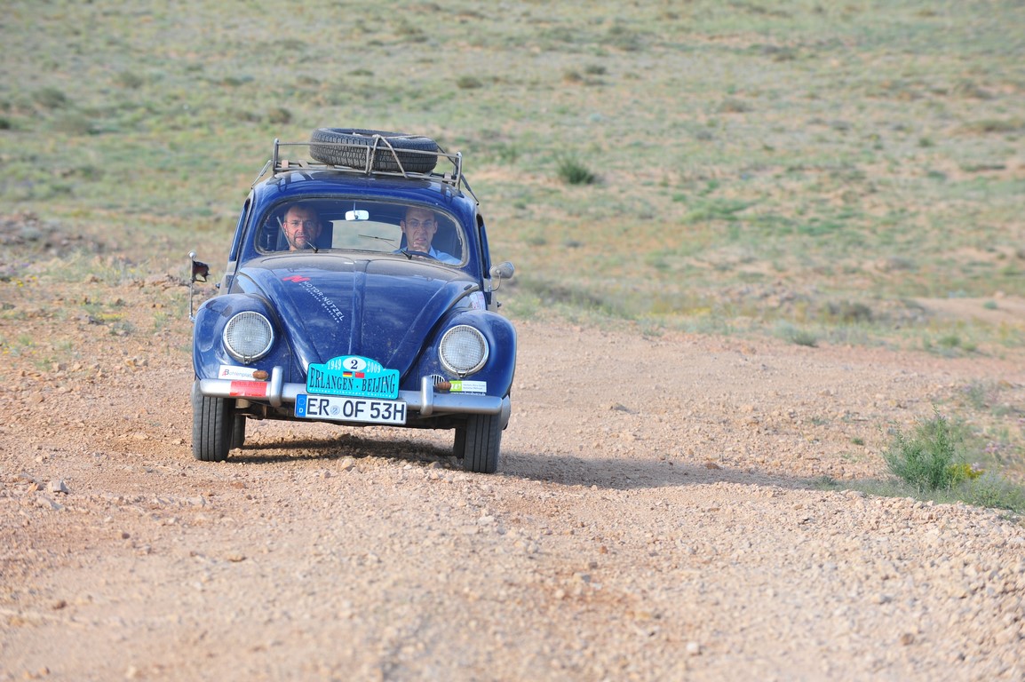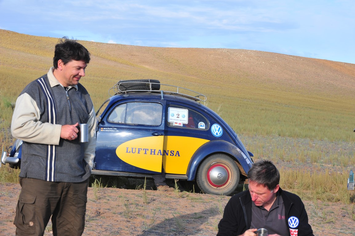 Die weiteren beiden Teams hatten sich vorab jeweils einen Standard Ovali gekauft, den sie für die Fahrt nutzten. Der Käfer von Team 4 war ein recht gut erhaltener und restaurierter Ovali aus dem Jahr 1956, den Bernd Boesenberg aus Baden-Württemberg von einem Polizisten gekauft hatte. Der Wagen bekam für die Fahrt dann Sonderausstattung wie z.B. gut gepolsterte Recaro-Sitze, Sicherheitsgurte, Tag-licht mit LEDs und die Rücksitzbank wurde entfernt und dafür eine Ladefläche eingelegt. Wir hatten ur-sprünglich auf Originalität wert gelegt. Ich wollte mich aber zu diesem Punkt vor der Reise nicht zu deutlich äußern. Es wurde uns allen während der Fahrt klar, dass Volkswagen die vielen Verbesserungen vor allem in der Anfangszeit des Käfers sehr wohl sinnfällig implementiert hatte, denn sowohl im Fahrkomfort als auch in der Zuverlässigkeit merkte man jedes Jahr Unterschied. So hatte der Ovali des Teams 4 neben ab und zu einer leeren Batterie keine Probleme während der ganzen Fahrt. Bernd war im Vorfeld für die genaue Strecken-planung zuständig und die Interfaceperson für die Reiseagentur in der Mongolei. Rainer hatte ich gebeten, in Deutschland vor der Reise die Presseaktivitäten zu managen und das gelang ihm durch seine Kontakte in Erlangen und Nürnberg außerordentlich gut.