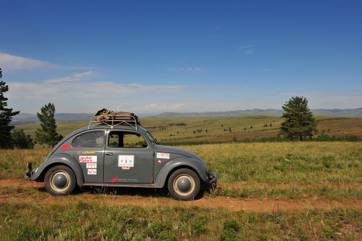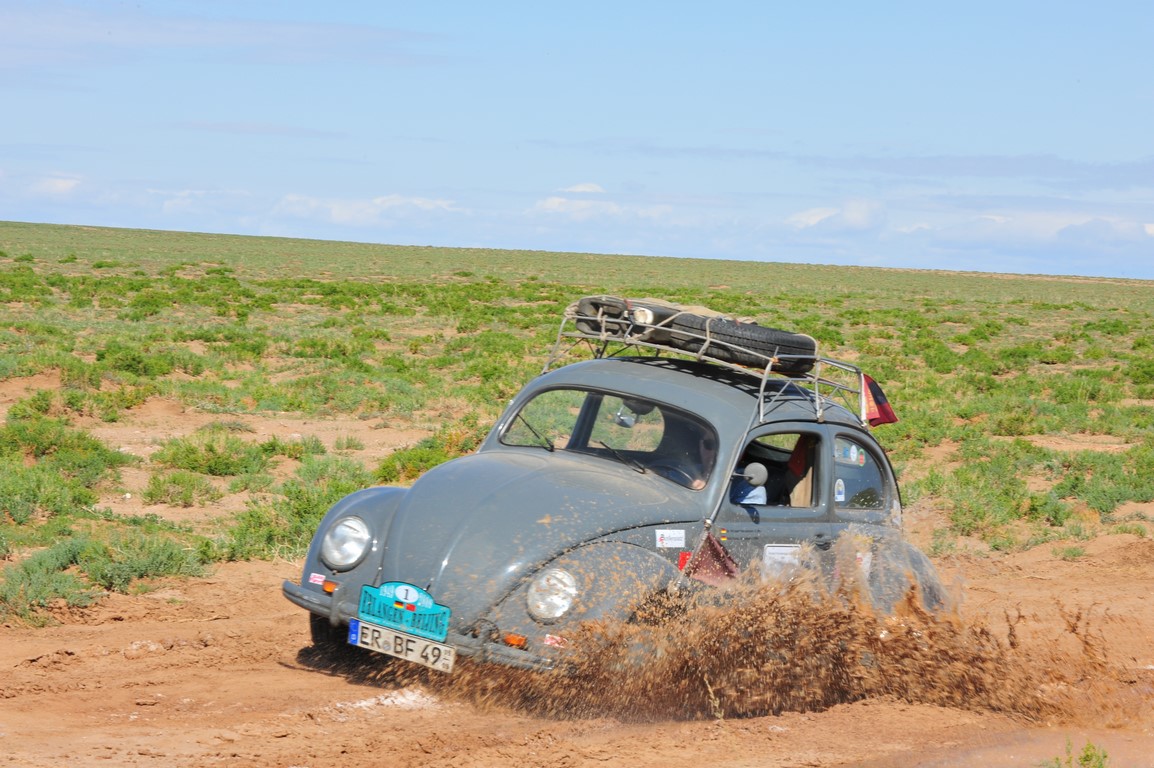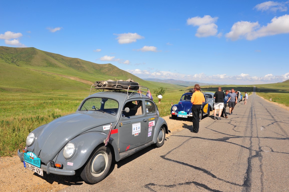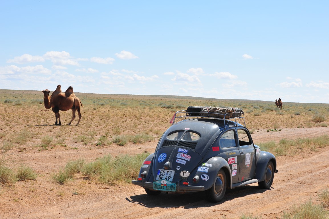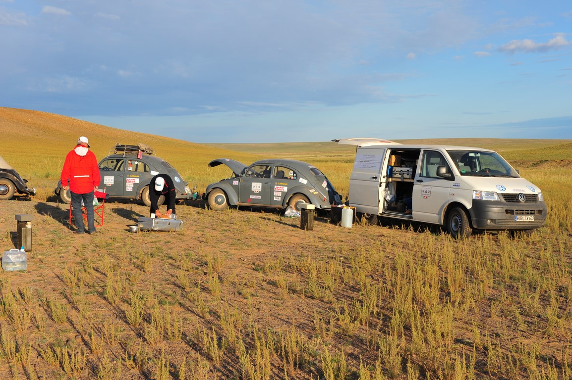 Die weiteren beiden Teams hatten sich vorab jeweils einen Standard Ovali gekauft, den sie für die Fahrt nutzten. Der Käfer von Team 4 war ein recht gut erhaltener und restaurierter Ovali aus dem Jahr 1956, den Bernd Boesenberg aus Baden-Württemberg von einem Polizisten gekauft hatte. Der Wagen bekam für die Fahrt dann Sonderausstattung wie z.B. gut gepolsterte Recaro-Sitze, Sicherheitsgurte, Tag-licht mit LEDs und die Rücksitzbank wurde entfernt und dafür eine Ladefläche eingelegt. Wir hatten ur-sprünglich auf Originalität wert gelegt. Ich wollte mich aber zu diesem Punkt vor der Reise nicht zu deutlich äußern. Es wurde uns allen während der Fahrt klar, dass Volkswagen die vielen Verbesserungen vor allem in der Anfangszeit des Käfers sehr wohl sinnfällig implementiert hatte, denn sowohl im Fahrkomfort als auch in der Zuverlässigkeit merkte man jedes Jahr Unterschied. So hatte der Ovali des Teams 4 neben ab und zu einer leeren Batterie keine Probleme während der ganzen Fahrt. Bernd war im Vorfeld für die genaue Strecken-planung zuständig und die Interfaceperson für die Reiseagentur in der Mongolei. Rainer hatte ich gebeten, in Deutschland vor der Reise die Presseaktivitäten zu managen und das gelang ihm durch seine Kontakte in Erlangen und Nürnberg außerordentlich gut.