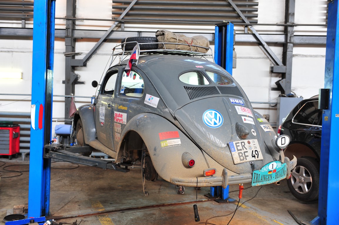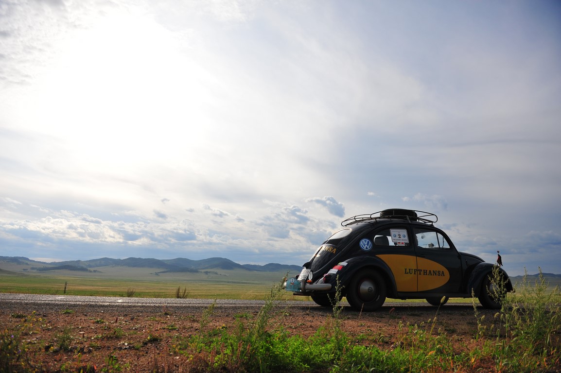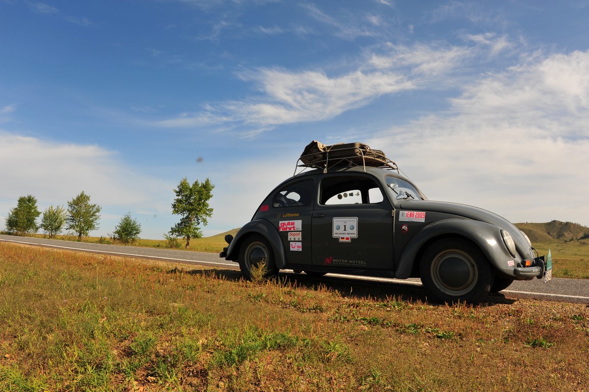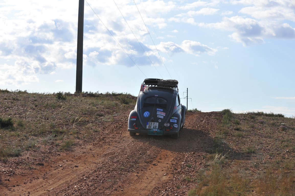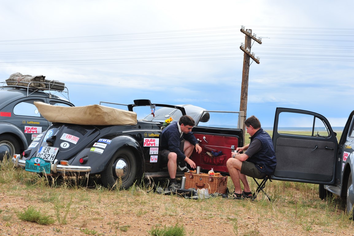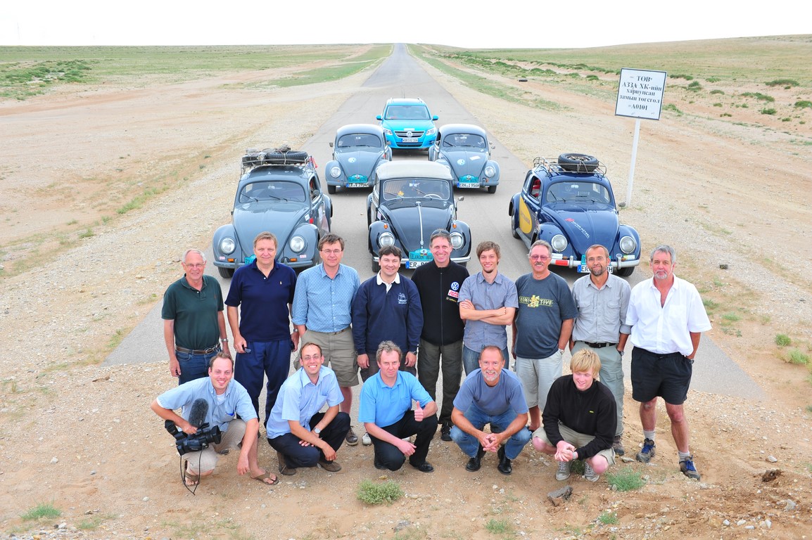 Die weiteren beiden Teams hatten sich vorab jeweils einen Standard Ovali gekauft, den sie für die Fahrt nutzten. Der Käfer von Team 4 war ein recht gut erhaltener und restaurierter Ovali aus dem Jahr 1956, den Bernd Boesenberg aus Baden-Württemberg von einem Polizisten gekauft hatte. Der Wagen bekam für die Fahrt dann Sonderausstattung wie z.B. gut gepolsterte Recaro-Sitze, Sicherheitsgurte, Tag-licht mit LEDs und die Rücksitzbank wurde entfernt und dafür eine Ladefläche eingelegt. Wir hatten ur-sprünglich auf Originalität wert gelegt. Ich wollte mich aber zu diesem Punkt vor der Reise nicht zu deutlich äußern. Es wurde uns allen während der Fahrt klar, dass Volkswagen die vielen Verbesserungen vor allem in der Anfangszeit des Käfers sehr wohl sinnfällig implementiert hatte, denn sowohl im Fahrkomfort als auch in der Zuverlässigkeit merkte man jedes Jahr Unterschied. So hatte der Ovali des Teams 4 neben ab und zu einer leeren Batterie keine Probleme während der ganzen Fahrt. Bernd war im Vorfeld für die genaue Strecken-planung zuständig und die Interfaceperson für die Reiseagentur in der Mongolei. Rainer hatte ich gebeten, in Deutschland vor der Reise die Presseaktivitäten zu managen und das gelang ihm durch seine Kontakte in Erlangen und Nürnberg außerordentlich gut.