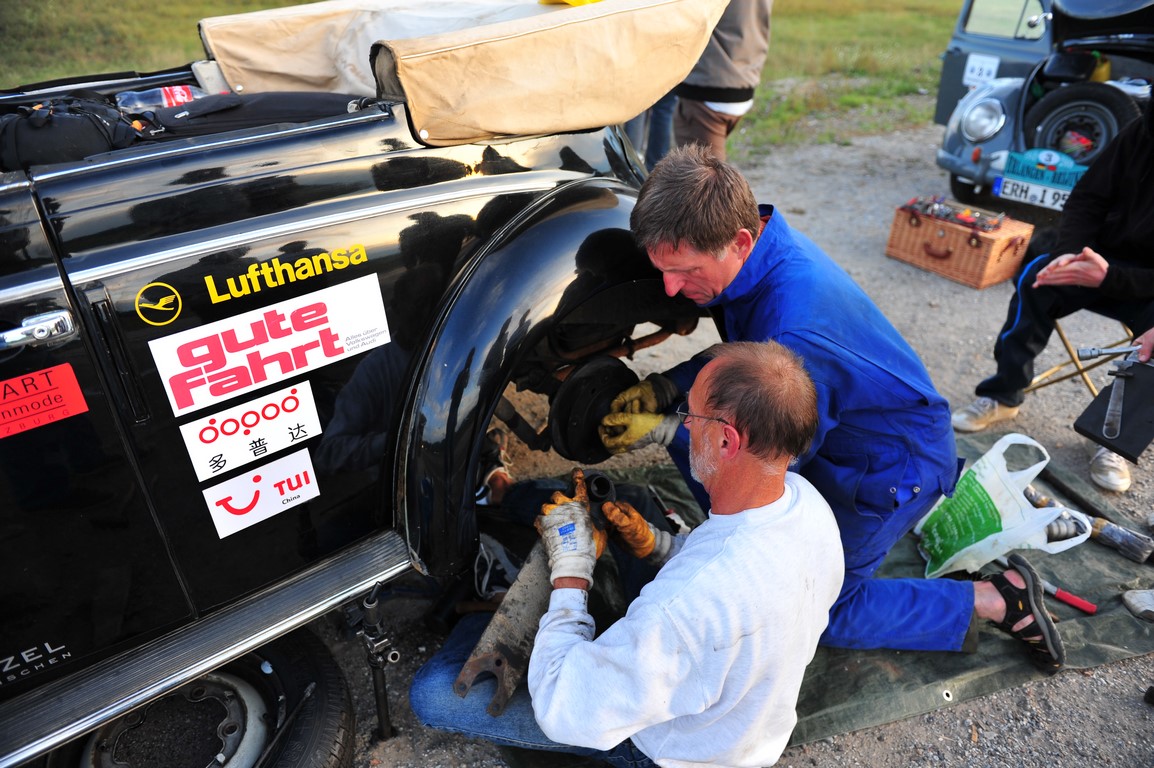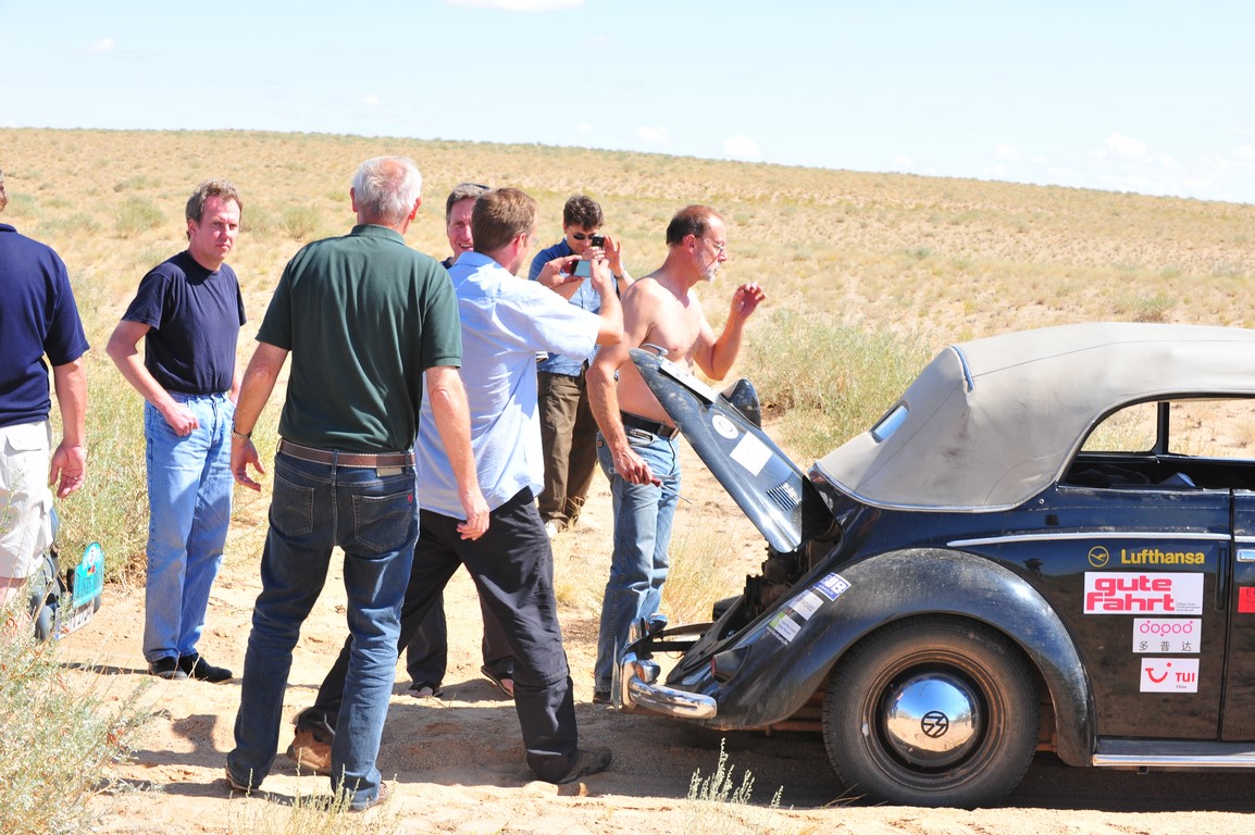 160 Watt Lichtmaschine des Cabrios bei Fahrt mit dem Abblendlicht scheinbar die Batterie nicht mehr laden konnte und einigen Hustern wegen „Überstaubung“ des Vergasers in der Wüste Gobi zuckelte der Wagen mit dem 30 PS Motor munter vor sich hin (der originale 24,5 PS Motor liegt in meiner Garage zuhause!) und wir hatten nur einmal eine größere Reparatur zwischen Irkutsk und Ulan Ude.