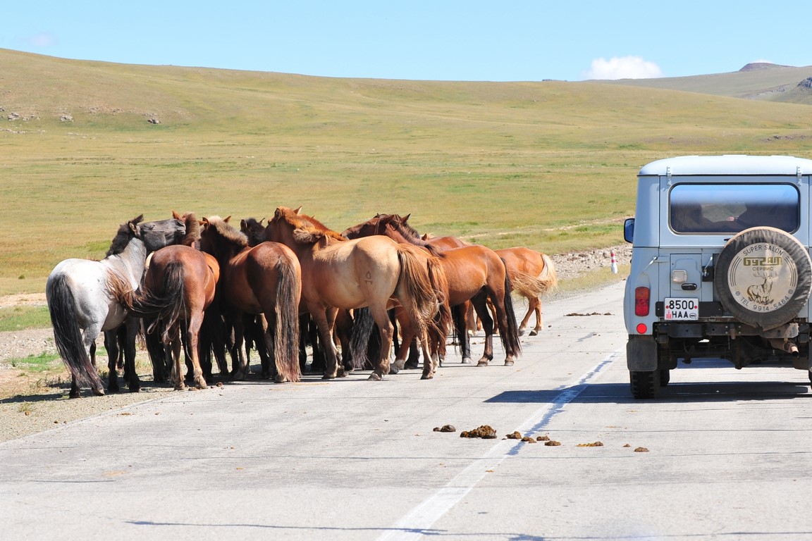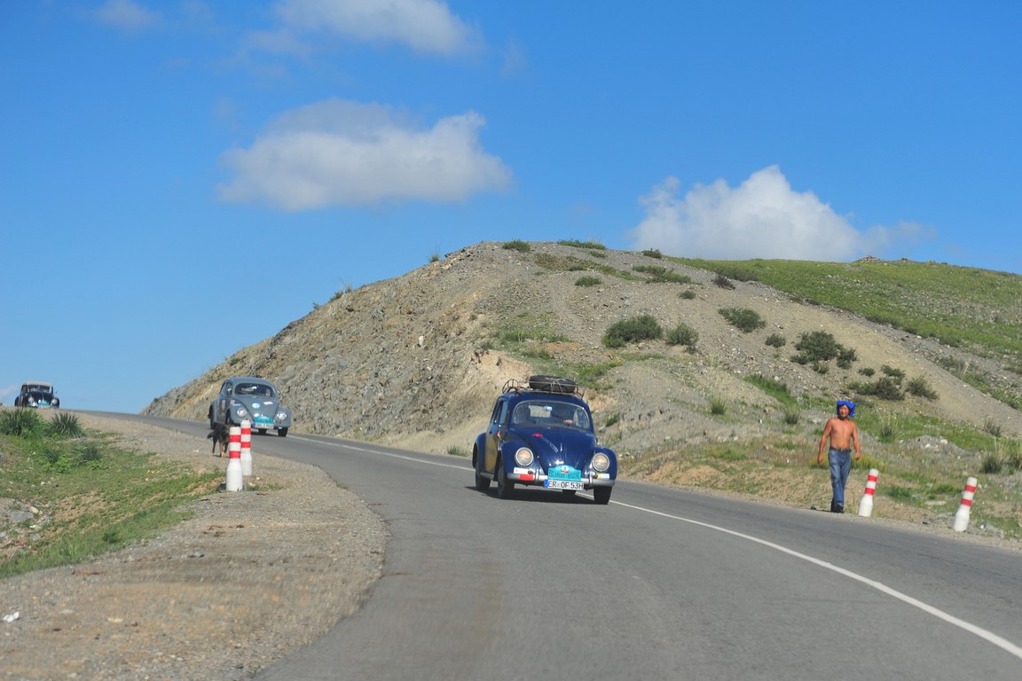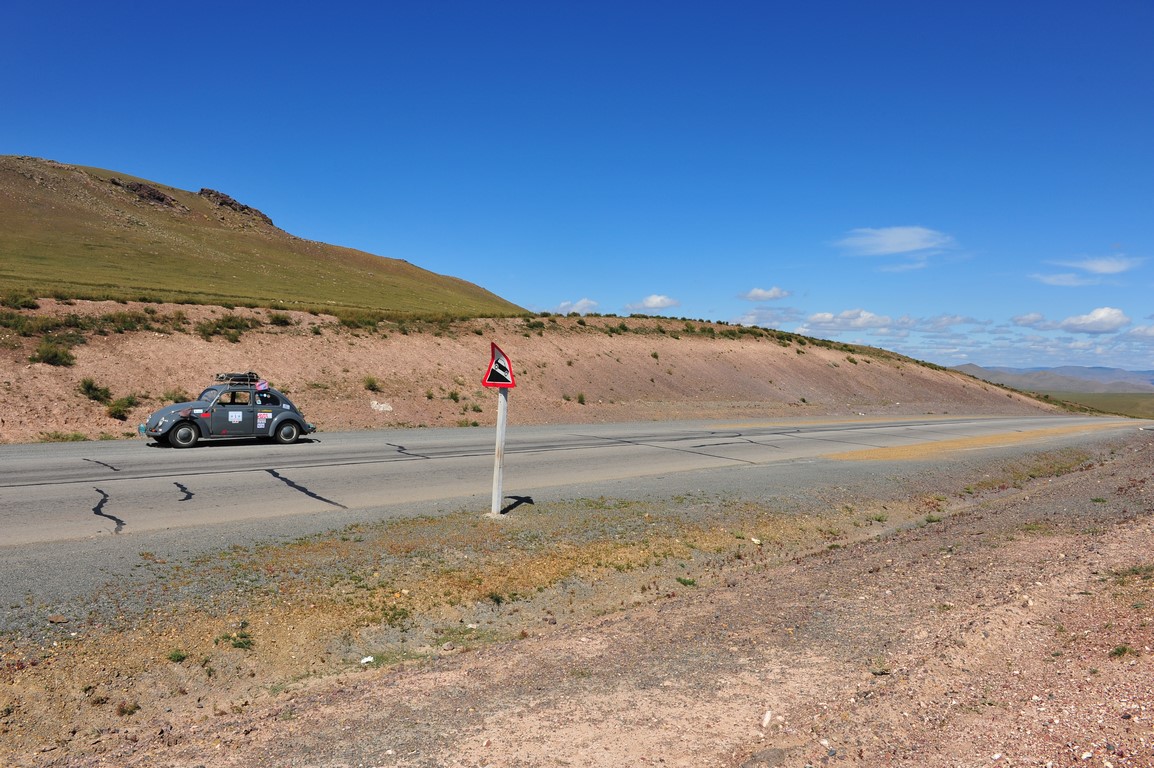 Das größte Problem waren die Tierherden, die immer wieder die Straße kreuzen wollten und die das laute Hupen unserer Autos relativ wenig beeindruckte. So hieß es immer bremsbereit sein, wenn sich die Ziege oder die Kuh dann doch noch entschied, die Straße zu überqueren. Schließlich sollten unsere Originalkotflügel keinen Schaden davontragen. Die Landschaft zeigte sich sehr beeindruckend, die Hügel mit kurzem Gras intensiv grün. Man könnte hier in der Mongolei riesige Golfplätze anlegen, ohne einmal Rasen neu säen zu müssen. Waldemar sagte immer, das ist ein einziger Golfplatz.
