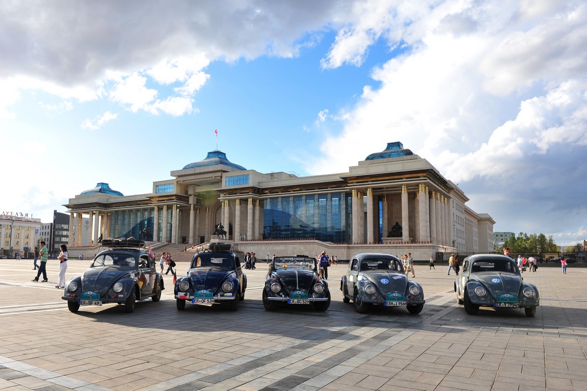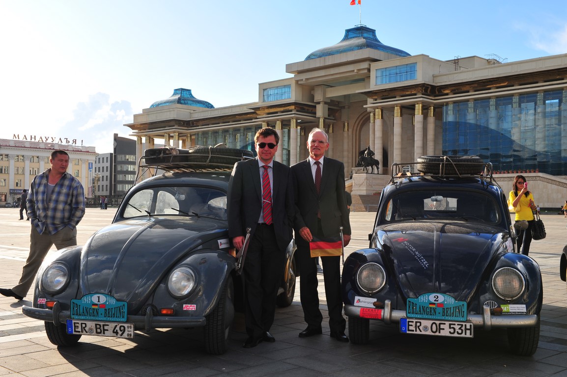 Dann holten wir unsere Käfer und fuhren auf den zentralen Platz von Ulan Bator. Dr. Fischer kam auch dazu.