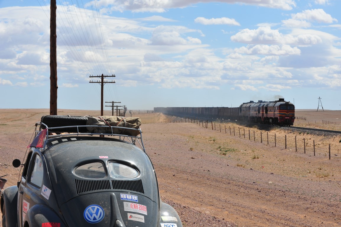 Das Cabrio litt plötzlich unter Motorproblemen, bedingt durch das enorme Staubaufkommen im Motorraum. Der Luftfilter verstopfte von Zeit zu Zeit und dies war leicht zu beheben. Wir fuhren immer an der transmongolischen Eisenbahn entlang, die Strommasten waren eine gute Führung in der ansonsten weiten Wüste. Wir passierten Dalnjargalan und Har-Ayrag, zwei kleine Eisenbahnstationen mit Siedlung.