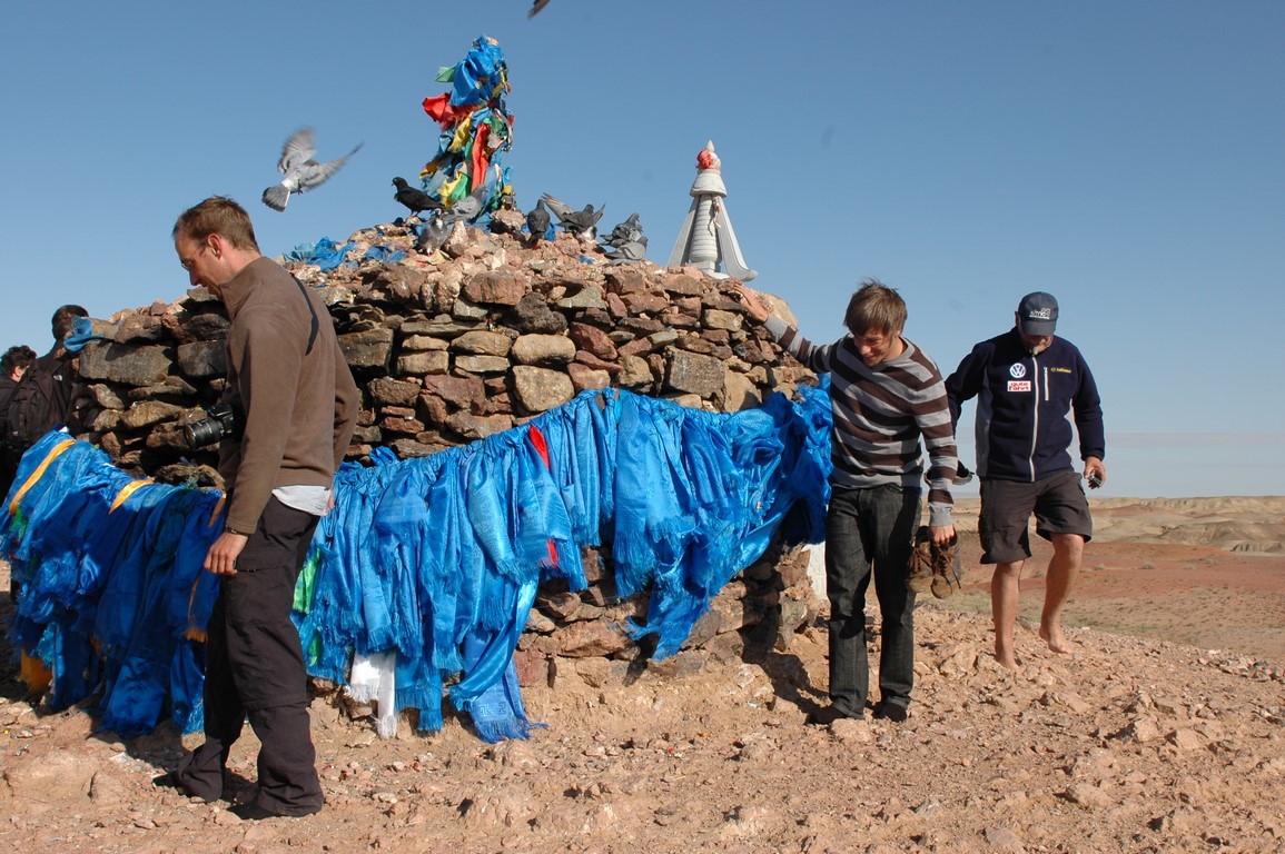 Es wurde ein ereignisreicher, aber auch wunderbarer Tag (zwei Platten, eine Not-OP, Hammelsuppe in Jurte, …), denn wir fuhren eine Strecke, die mit Sicherheit noch kein anderer Oldtimer gesehen hatte. Manchmal hatten wir den Eindruck, dass noch gar kein Auto diese Wege gefahren war. Zunächst fuhren wir noch das Buddhistische Engergiezentrum der Welt (Schambala) an, eine Anlage recht gewaltigen Ausmaßes, die wirklich sehenswert war, auch wenn sie erst vor vier Jahren gebaut wurde. In der Nähe das Kloster Khamryn Khiid, in dem noch aktive Mönche leben und ein kluger alter Schamane seine Weisheiten an die Menschen weitergibt. Sehr interessant sind dort auch die Dachverzierungen und –balken.