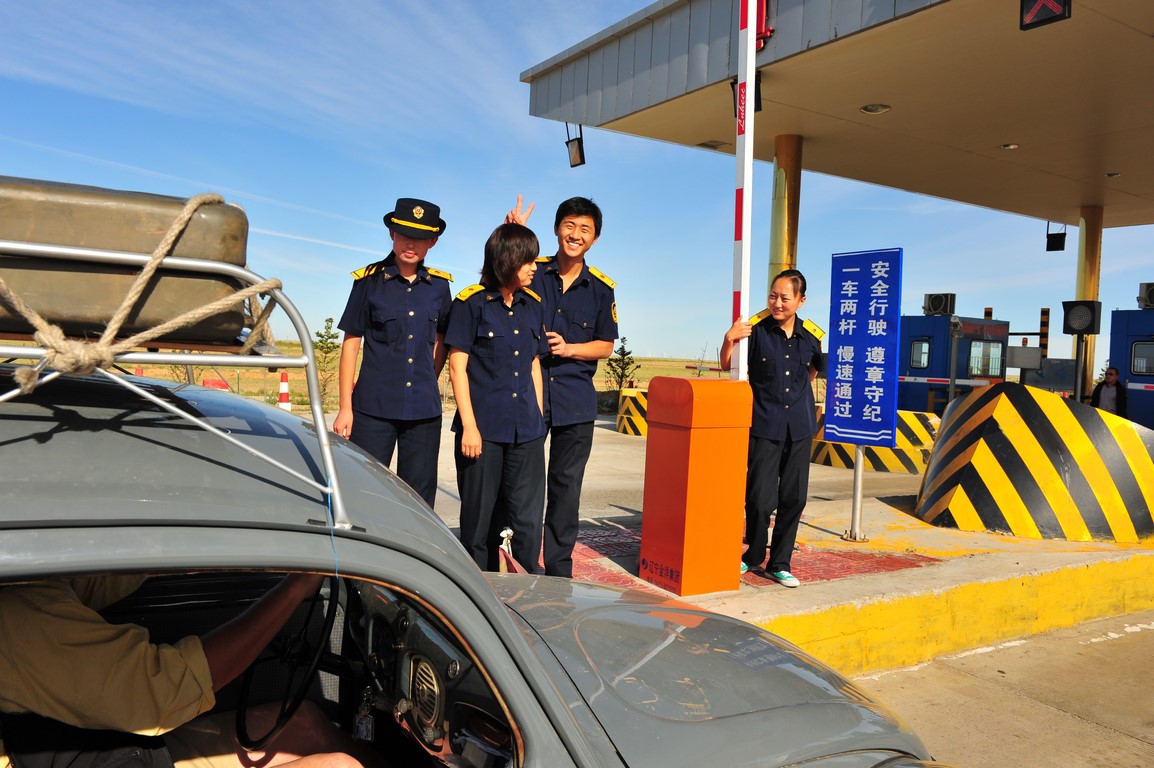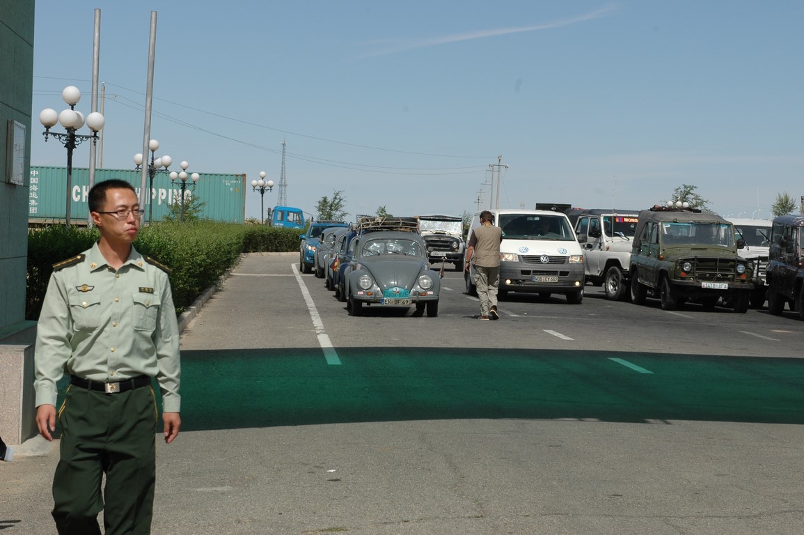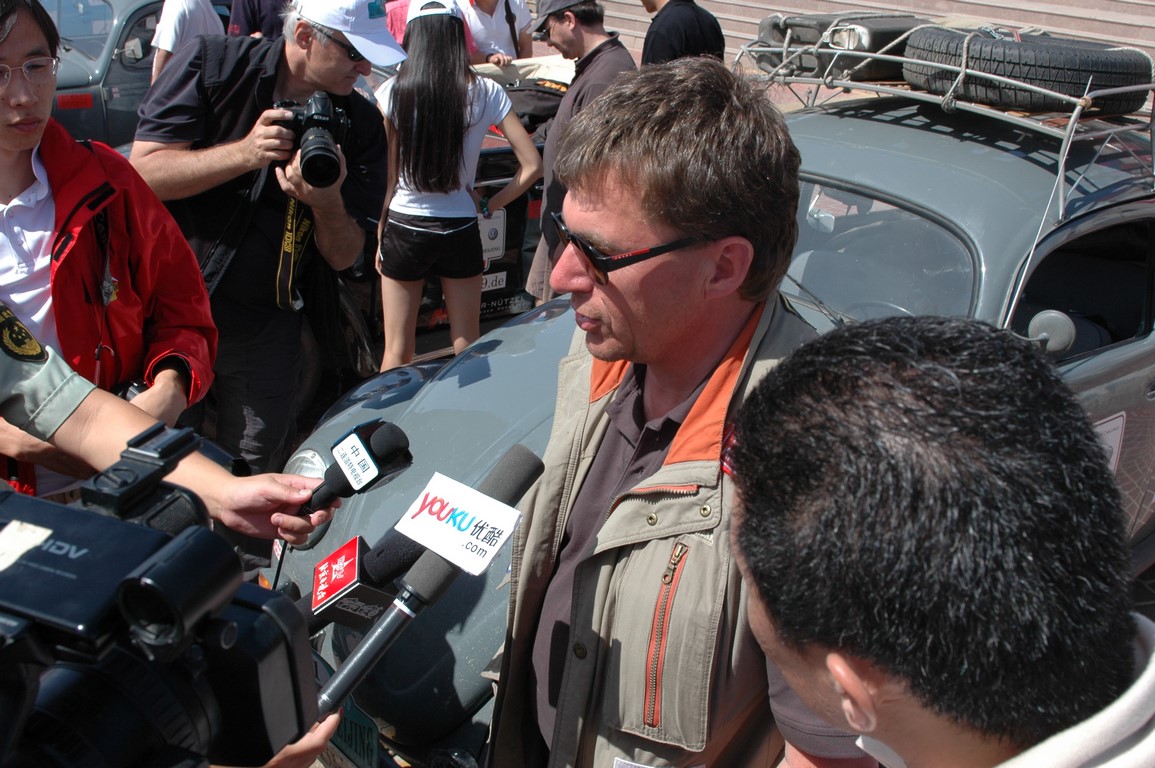 Meine Frau und die beiden Jungs waren schon auf dem Weg von Peking nach Datong und deshalb wollte ich gleich nach dem Event losfahren. Aber dann erfuhr ich, dass noch zwei Unterschriften des Zolls fehlten und die entsprechenden Mitarbeiter beim Mittagessen, einer davon sogar zuhause, seien. Wofür waren wir früh an der Grenze gewesen und hatten die Agentur eingeschaltet? Diese bemühte sich die Unterschriften heranzuholen und um 13.30 Uhr war es soweit: Wir konnten losfahren und hatten den Grenzübergang in ca. fünf Stunden geschafft, was letztlich auch keine schlechte Zeit ist für einen Konvoi von sieben Fahrzeugen war. Nach Geldabheben und Tanken ging es auf die Strecke, umschwirrt von Journalisten und Fotografen, die uns von allen Seiten während der Fahrt filmten und fotografierten.