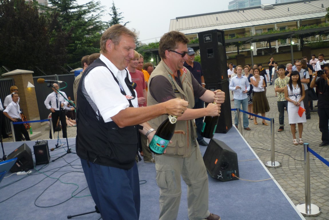 Wolfgang Heinrich von der Messe Nürnberg moderierte die ganze Veranstaltung, interviewte mich und die Teammitglieder. Kurz vor 9.00 Uhr kam auch unser Erlanger Oberbürgermeister Dr. Siegfried Balleis dazu. In farbigen Ballons übergab er uns frische Erlanger Luft, denn er habe gehört, dass die Luft in Peking doch nicht so gut sei. Da hat er Recht!