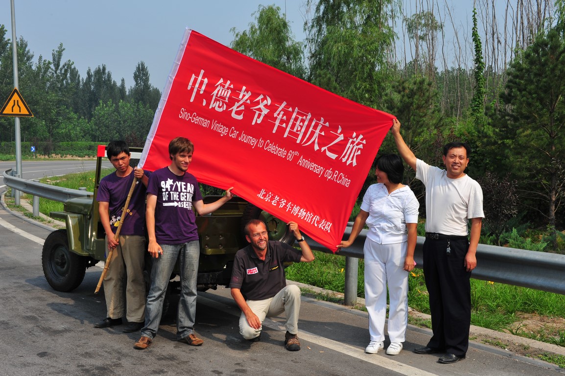 Wir wurden von einem alten amerikanischen Jeep von der Autobahn abgeholt. Am Museum dann ein Trommel-wirbel und laute Musik. Es standen bereits fünf Hong Qi’s vor dem Museum, einer davon ein Cabriolet. Nach kurzem Rundgang durch das Museum (ca. 160 Exponate, davon 25 Hong Qi’s) und nach einigen kurzen Ansprachen fuhren wir dann im Konvoi – abwechselnd Käfer und Hong Qi - zur Mauer. Hier erhielten wir unsere Urkunden vorbereitet und überreicht durch Herrn Luo. Es war die erste Sino-German Vintage Car Parade zur Großen Mauer, und das anlässlich der 60 Jahr Feier der Volksrepublik China.
